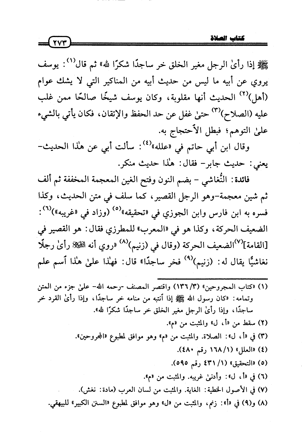 (إِذا رَأَى الرجل مغير الْخلق خر سَاجِدا شكرا لله» ثمَّ قَالَ: يُوسُف يروي عَن أَبِيه مَا لَيْسَ من حَدِيث أَبِيه من الْمَنَاكِير الَّتِي لَا يشك عوام (أهل) الحَدِيث أَنَّهَا مَقْلُوبَة، وَكَانَ يُوسُف شَيخا صَالحا مِمَّن غلب عَلَيْهِ (الصّلاح) حَتَّى غفل عَن حد الْحِفْظ والإتقان، فَكَانَ يَأْتِي بالشَّيْء عَلَى التَّوَهُّم؛ فَبَطل الِاحْتِجَاج بِهِ.