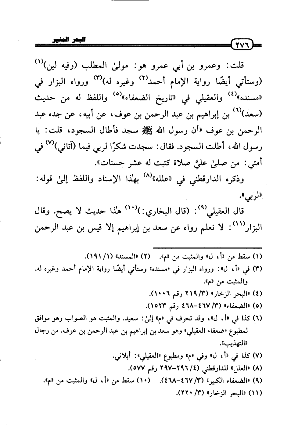 قلت: وَعَمْرو بن أبي عَمْرو هُوَ: مولَى الْمطلب (وَفِيه لين) (وَسَتَأْتِي أَيْضا رِوَايَة الإِمَام أَحْمد وَغَيره لَهُ) وَرَوَاهُ الْبَزَّار فِي «مُسْنده» والعقيلي فِي «تَارِيخ الضُّعَفَاء» وَاللَّفْظ لَهُ من حَدِيث (سعد) بن إِبْرَاهِيم بن عبد الرَّحْمَن بن عَوْف، عَن أَبِيه، عَن جده عبد الرَّحْمَن بن عَوْف «أَن رَسُول الله - صَلَّى الله عَلَيْهِ وَسلم - سجد فَأطَال السُّجُود، قلت: يَا رَسُول الله، أطلت السُّجُود. فَقَالَ: سجدت شكرا لرَبي فِيمَا (آتَانِي) فِي أمتِي: من صَلَّى عليَّ صَلَاة كتبت لَهُ عشر حَسَنَات» .