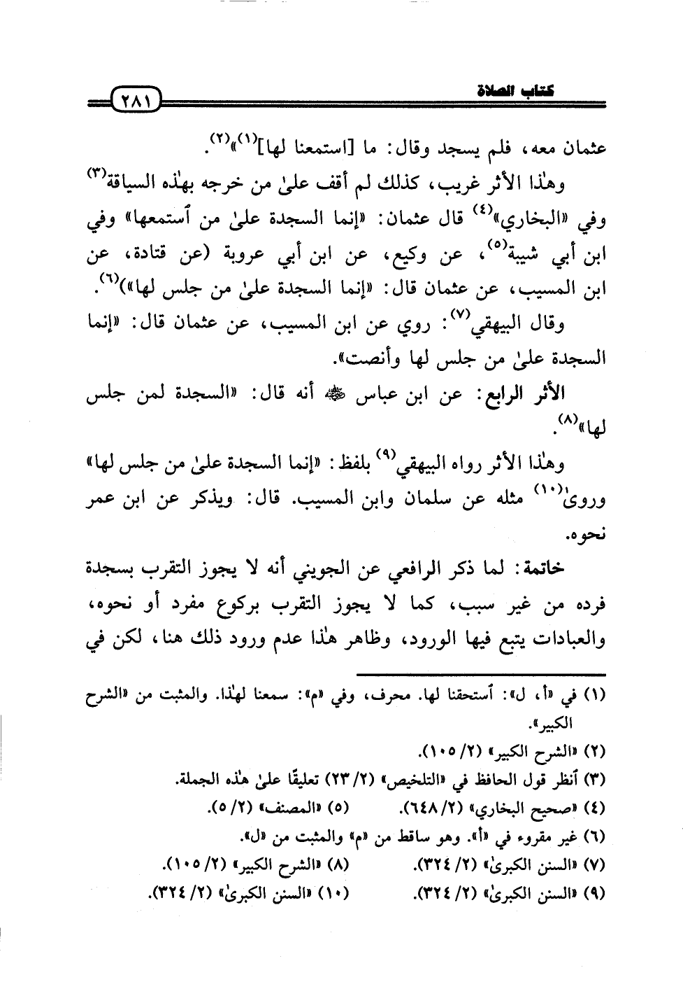 خَاتِمَة: لما ذكر الرَّافِعِيّ عَن الْجُوَيْنِيّ أَنه لَا يجوز التَّقَرُّب بِسَجْدَة فَرده من غير سَبَب، كَمَا لَا يجوز التَّقَرُّب بركوع مُفْرد أَو نَحوه، والعبادات يتبع فِيهَا الْوُرُود، وَظَاهر هَذَا عدم وُرُود ذَلِك هُنَا، لَكِن فِي