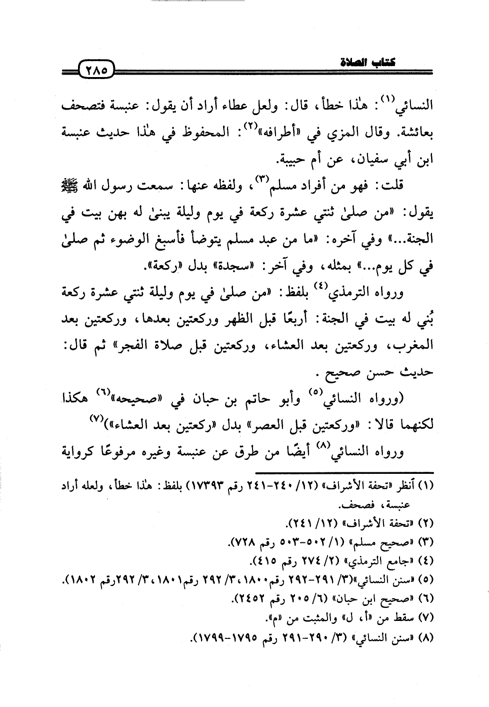 وَرَوَاهُ التِّرْمِذِيّ بِلَفْظ: «من صَلَّى فِي يَوْم وَلَيْلَة ثِنْتَيْ عشرَة رَكْعَة بُني لَهُ بَيت فِي الْجنَّة: أَرْبعا قبل الظّهْر وَرَكْعَتَيْنِ بعْدهَا، وَرَكْعَتَيْنِ بعد الْمغرب، وَرَكْعَتَيْنِ بعد الْعشَاء، وَرَكْعَتَيْنِ قبل صَلَاة الْفجْر» ثمَّ قَالَ: حَدِيث حسن صَحِيح. (وَرَوَاهُ النَّسَائِيّ وَأَبُو حَاتِم بن حبَان فِي «صَحِيحه» هَكَذَا لكنهما قَالَا: «وَرَكْعَتَيْنِ قبل الْعَصْر» بدل «رَكْعَتَيْنِ بعد الْعشَاء» ) وَرَوَاهُ النَّسَائِيّ أَيْضا من طرق عَن عَنْبَسَة وَغَيره مَرْفُوعا كَرِوَايَة