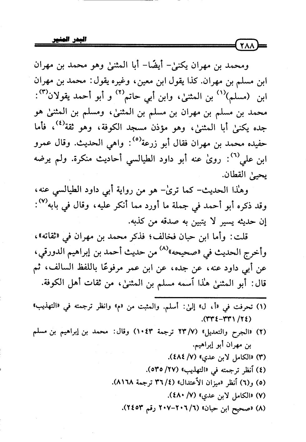 قلت: وَأما ابْن حبَان فَخَالف؛ فَذكر مُحَمَّد بن مهْرَان فِي (ثقاته) ، وَأخرج الحَدِيث فِي «صَحِيحه» من حَدِيث أَحْمد بن إِبْرَاهِيم الدَّوْرَقِي، عَن أبي دَاوُد عَنهُ، عَن جده، عَن ابْن عمر مَرْفُوعا بِاللَّفْظِ السالف، ثمَّ قَالَ: أَبُو الْمثنى هَذَا اسْمه مُسلم بن الْمثنى، من ثِقَات أهل الْكُوفَة.