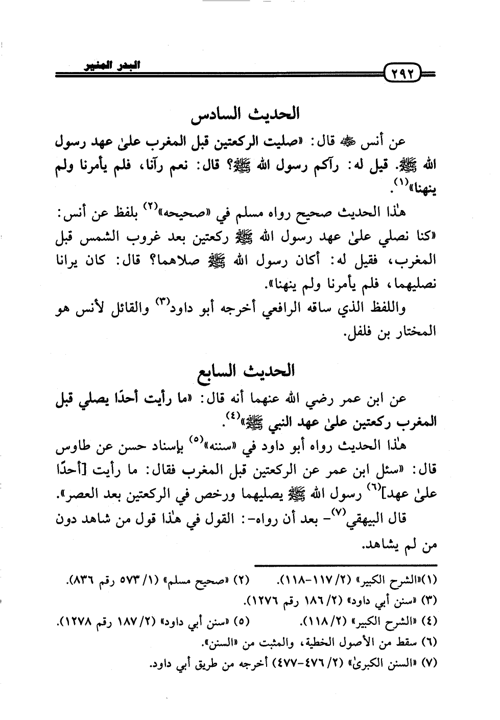 هَذَا الحَدِيث رَوَاهُ أَبُو دَاوُد فِي «سنَنه» بِإِسْنَاد حسن عَن طَاوس قَالَ: «سُئِلَ ابْن عمر عَن الرَّكْعَتَيْنِ قبل الْمغرب فَقَالَ: مَا رَأَيْت [أحدا عَلَى عهد] رَسُول الله - صَلَّى الله عَلَيْهِ وَسلم - يُصَلِّيهمَا وَرخّص فِي الرَّكْعَتَيْنِ بعد الْعَصْر» .