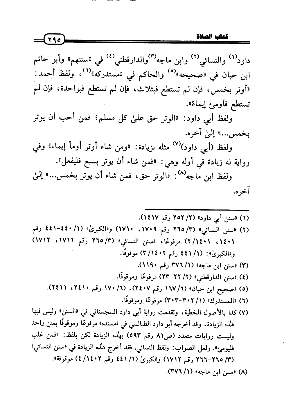 دَاوُد وَالنَّسَائِيّ وَابْن مَاجَه وَالدَّارَقُطْنِيّ فِي «سُنَنهمْ» وَأَبُو حَاتِم بن حبَان فِي «صَحِيحه» وَالْحَاكِم فِي «مُسْتَدْركه» ، وَلَفظ أَحْمد: «أوتر بِخمْس، فَإِن لم تستطع فبثلاث، فَإِن لم تستطع فبواحدة، فَإِن لم تستطع فأومئ إِيمَاء» .