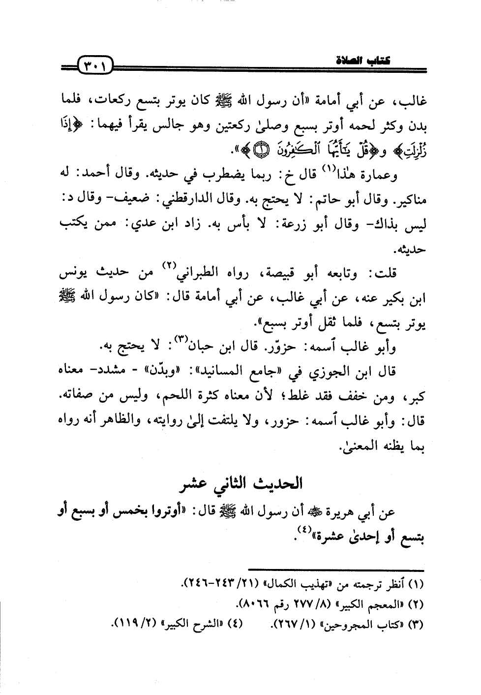 غَالب، عَن أبي أُمَامَة «أَن رَسُول الله - صَلَّى الله عَلَيْهِ وَسلم - كَانَ يُوتر بتسع رَكْعَات، فَلَمَّا بدن وَكثر لَحْمه أوتر بِسبع وَصَلى رَكْعَتَيْنِ وَهُوَ جَالس يقْرَأ فيهمَا: (إِذا زلزلت) و (قل يَا أَيهَا الْكَافِرُونَ) .» .