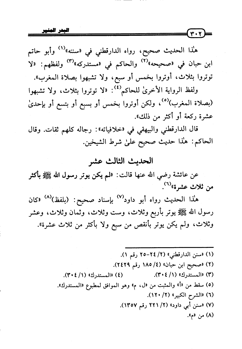 وَلَفظ الرِّوَايَة الْأُخْرَى للْحَاكِم: «لَا توتروا بِثَلَاث، وَلَا تشبهوا (بِصَلَاة الْمغرب) ، وَلَكِن أوتروا بِخمْس أَو بِسبع أَو بتسع أَو بِإِحْدَى عشرَة رَكْعَة أَو أَكثر من ذَلِك» .