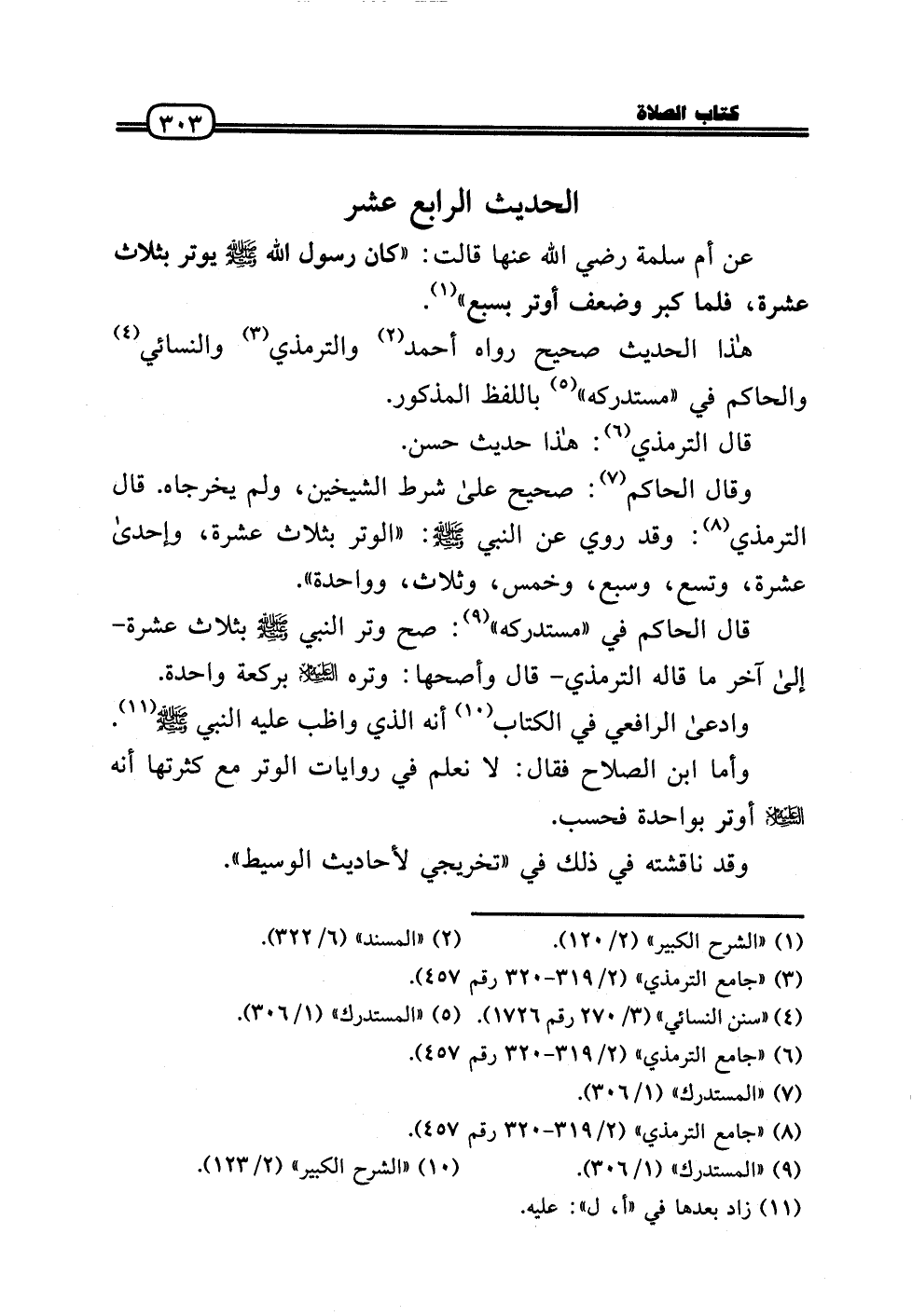 وَقَالَ الْحَاكِم: صَحِيح عَلَى شَرط الشَّيْخَيْنِ، وَلم يخرجَاهُ. قَالَ التِّرْمِذِيّ: وَقد رُوِيَ عَن النَّبِي - صَلَّى الله عَلَيْهِ وَسلم -: «الْوتر بِثَلَاث عشرَة، وَإِحْدَى عشرَة، وتسع، وَسبع، وَخمْس، وَثَلَاث، وَوَاحِدَة» .