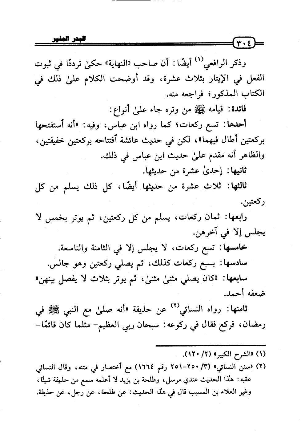 وَذكر الرَّافِعِيّ أَيْضا: أَن صَاحب «النِّهَايَة» حَكَى ترددًا فِي ثُبُوت الْفِعْل فِي الإيتار بِثَلَاث عشرَة، وَقد أوضحت الْكَلَام عَلَى ذَلِك فِي الْكتاب الْمَذْكُور؛ فَرَاجعه مِنْهُ.