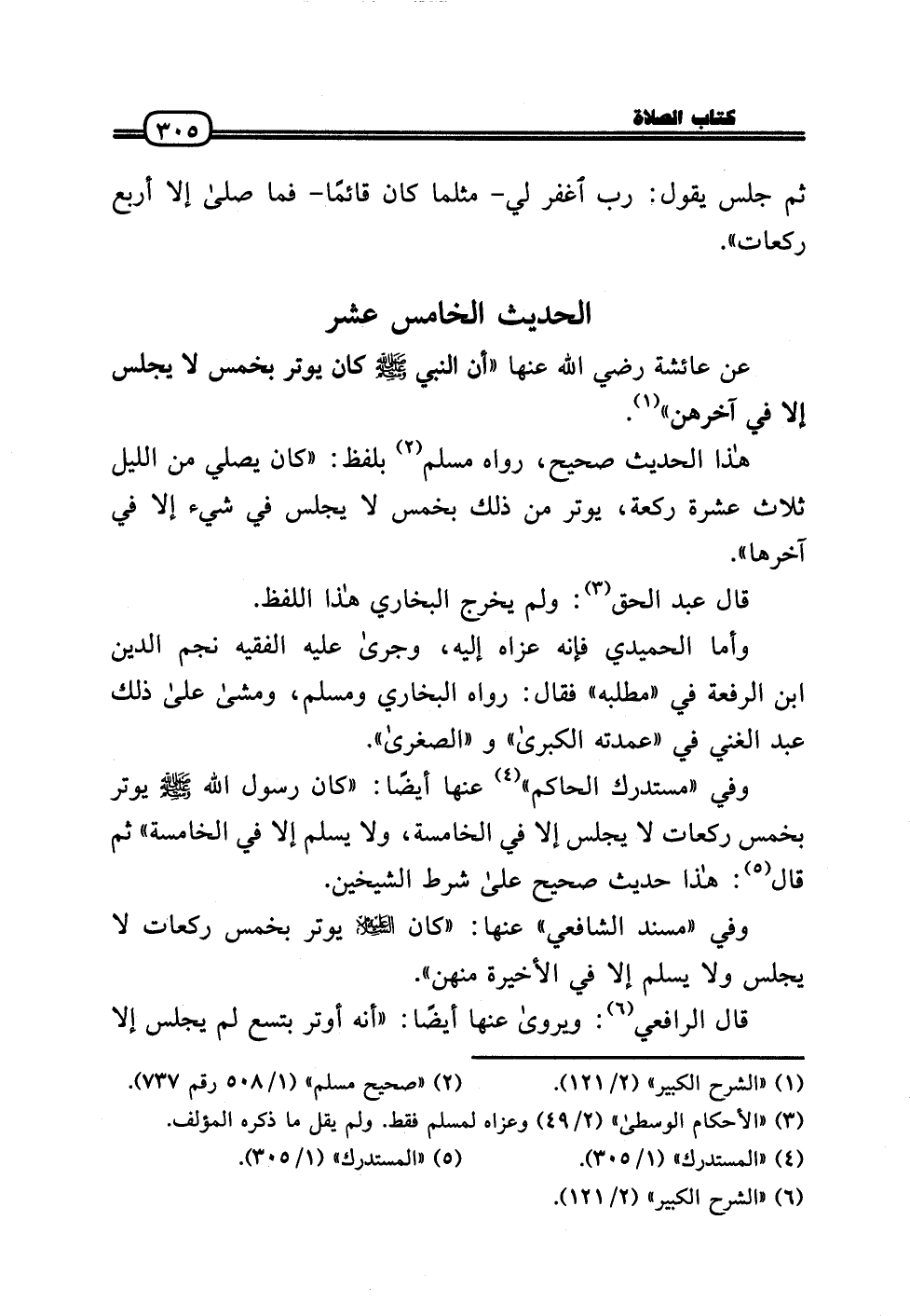 وَفِي «مُسْتَدْرك الْحَاكِم» عَنْهَا أَيْضا: «كَانَ رَسُول الله - صَلَّى الله عَلَيْهِ وَسلم - يُوتر بِخمْس رَكْعَات لَا يجلس إِلَّا فِي الْخَامِسَة، وَلَا يسلم إِلَّا فِي الْخَامِسَة» ثمَّ قَالَ: هَذَا حَدِيث صَحِيح عَلَى شَرط الشَّيْخَيْنِ.