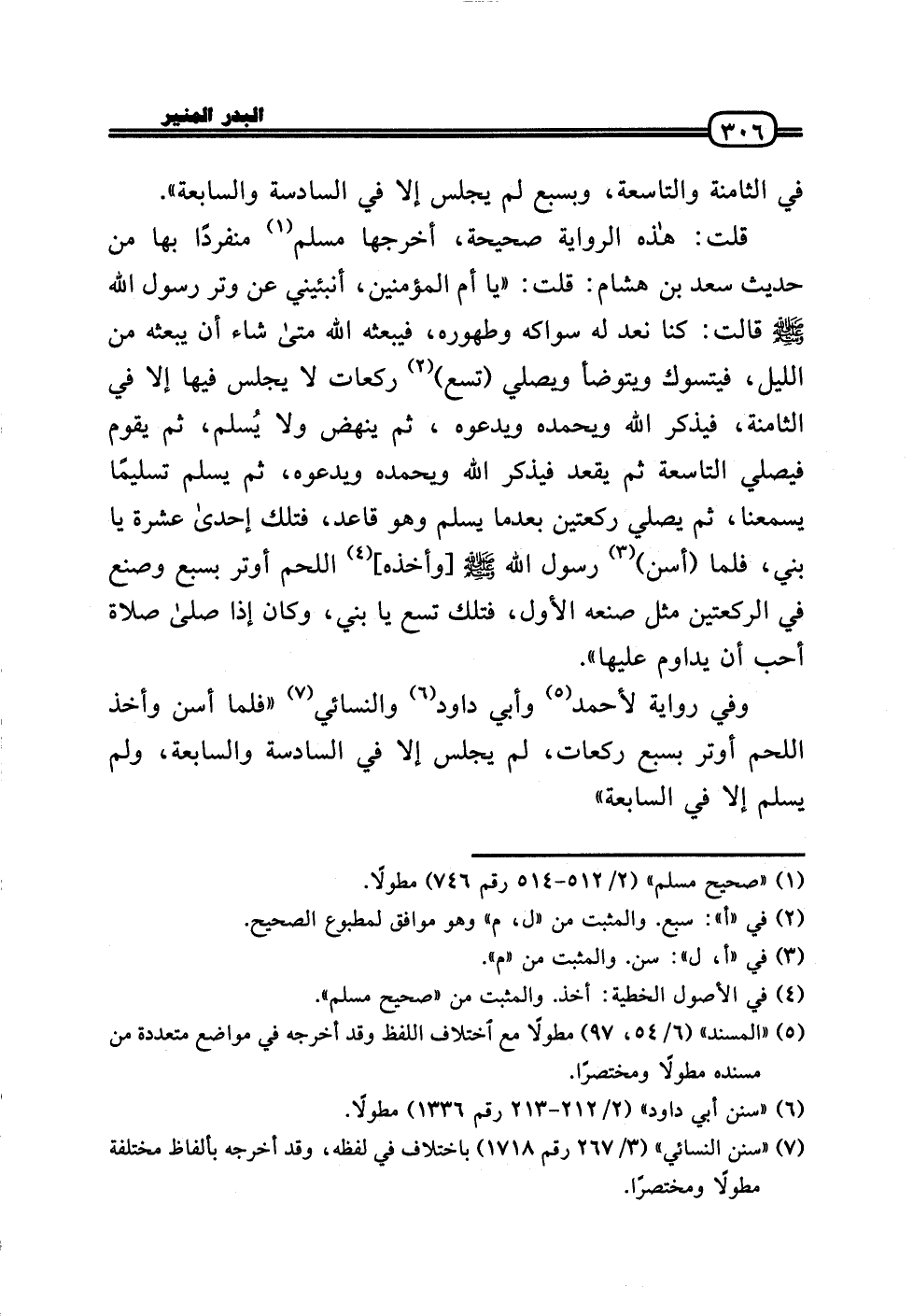 قلت: هَذِه الرِّوَايَة صَحِيحَة، أخرجهَا مُسلم مُنْفَردا بهَا من حَدِيث سعد بن هِشَام: قلت: «يَا أم الْمُؤمنِينَ، أَنْبِئِينِي عَن وتر رَسُول الله - صَلَّى الله عَلَيْهِ وَسلم - قَالَت: كُنَّا نعد لَهُ سواكه وَطهُوره، فيبعثه الله مَتى شَاءَ أَن يَبْعَثهُ من اللَّيْل، فيتسوك وَيتَوَضَّأ وَيُصلي (تسع) رَكْعَات لَا يجلس فِيهَا إِلَّا فِي الثَّامِنَة، فيذكر الله وَيَحْمَدهُ ويدعوه، ثمَّ ينْهض وَلَا يُسلم، ثمَّ يقوم فَيصَلي التَّاسِعَة ثمَّ يقْعد فيذكر الله وَيَحْمَدهُ ويدعوه، ثمَّ يسلم تَسْلِيمًا يسمعنا، ثمَّ يُصَلِّي رَكْعَتَيْنِ بَعْدَمَا يسلم وَهُوَ قَاعد، فَتلك إِحْدَى عشرَة يَا بني، فَلَمَّا (أسن) رَسُول الله - صَلَّى الله عَلَيْهِ وَسلم -[وَأَخذه] اللَّحْم أوتر بِسبع وصنع فِي الرَّكْعَتَيْنِ مثل صنعه الأول، فَتلك تسع يَا بني، وَكَانَ إِذا صَلَّى صَلَاة أحب أَن يداوم عَلَيْهَا» .