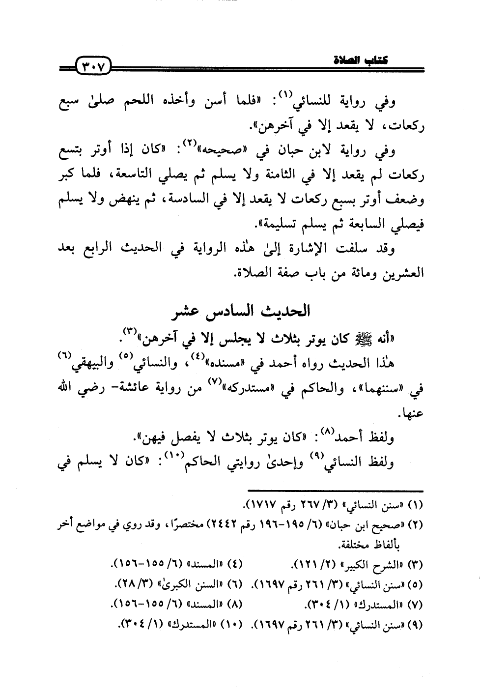 «أنَّه - صَلَّى الله عَلَيْهِ وَسلم - كَانَ يُوتر بِثَلَاث لَا يجلس إِلَّا فِي آخِرهنَّ» .
