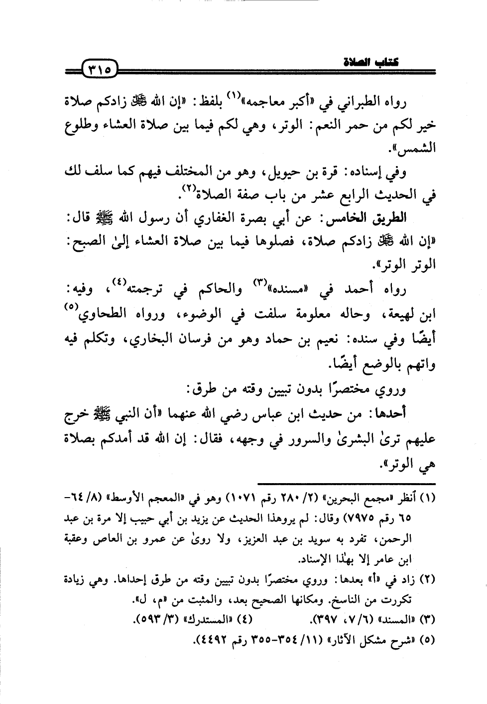 رَوَاهُ الطَّبَرَانِيّ فِي «أكبر معاجمه» بِلَفْظ: «إِن الله عَزَّ وَجَلَّ زادكم صَلَاة خير لكم من حمر النعم: الْوتر، وَهِي لكم فِيمَا بَين صَلَاة الْعشَاء وطلوع الشَّمْس» .
