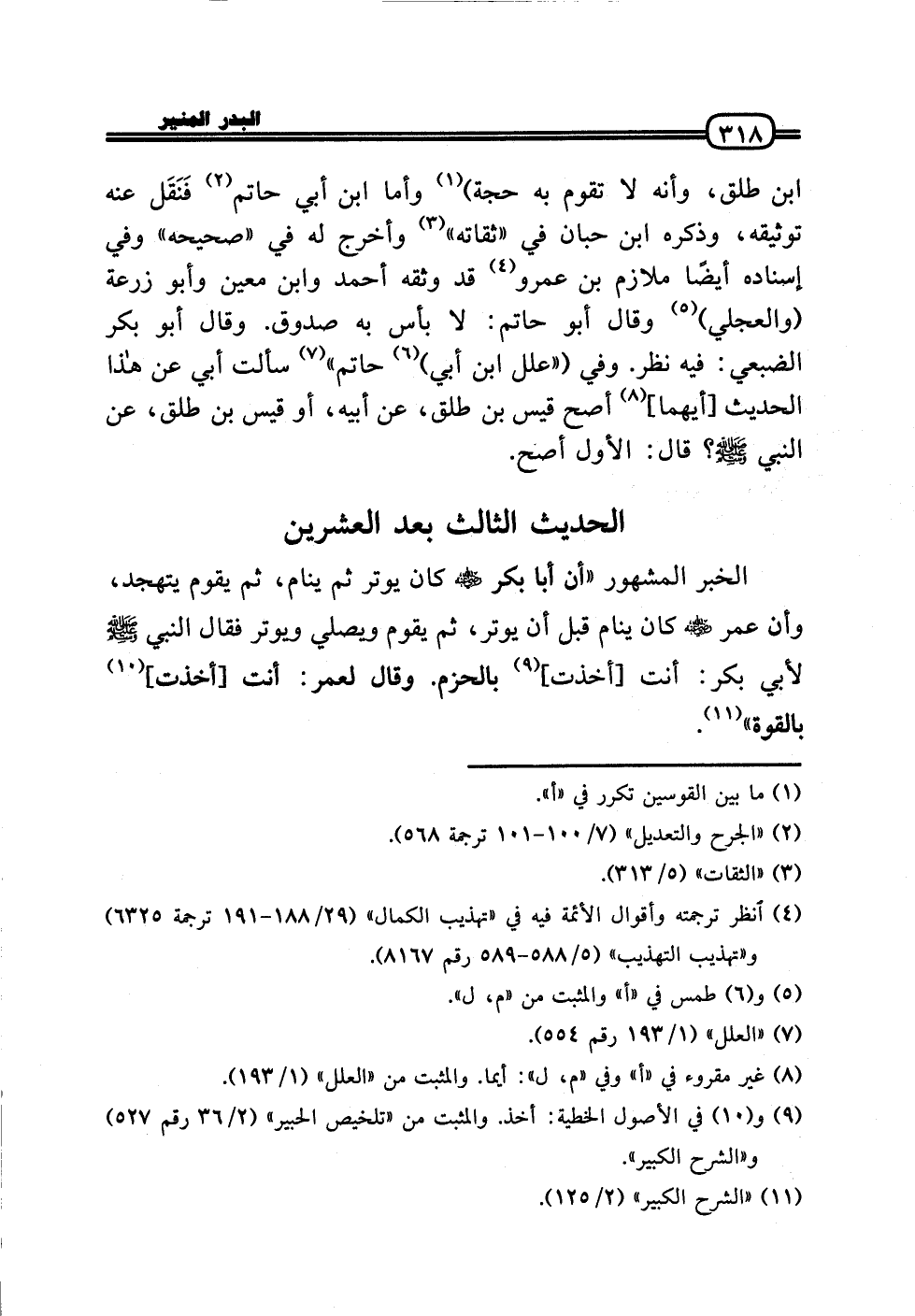 بن طلق، وَأَنه لَا تقوم بِهِ حجَّة) وَأما ابْن أبي حَاتِم فَنَقَل عَنهُ توثيقه، وَذكره ابْن حبَان فِي «ثقاته» وَأخرج لَهُ فِي «صَحِيحه» وَفِي إِسْنَاده أَيْضا ملازم بن عَمْرو قد وَثَّقَهُ أَحْمد وَابْن معِين وَأَبُو زرْعَة (وَالْعجلِي) وَقَالَ أَبُو حَاتِم: لَا بَأْس بِهِ صَدُوق. وَقَالَ أَبُو بكر الضبعِي: فِيهِ نظر. وَفِي « (علل ابْن أبي) حَاتِم» سَأَلت أبي عَن هَذَا الحَدِيث [أَيهمَا] أصح قيس بن طلق، عَن أَبِيه، أَو قيس بن طلق، عَن النَّبِي - صَلَّى الله عَلَيْهِ وَسلم -؟ قَالَ: الأول أصح.