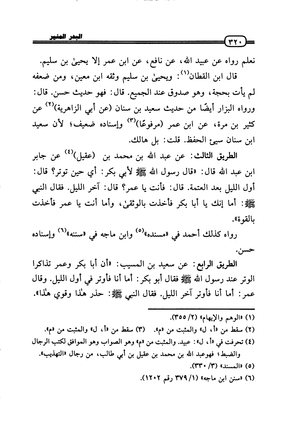 الطَّرِيق الثَّالِث: عَن عبد الله بن مُحَمَّد بن (عقيل) عَن جَابر بن عبد الله قَالَ: (قَالَ رَسُول الله - صَلَّى الله عَلَيْهِ وَسلم - لأبي بكر: أَي حِين توتر؟ قَالَ: أول اللَّيْل بعد الْعَتَمَة. قَالَ: فَأَنت يَا عمر؟ قَالَ: آخر اللَّيْل. فَقَالَ النَّبِي - صَلَّى الله عَلَيْهِ وَسلم -: أما إِنَّك يَا أَبَا بكر فَأخذت بالوثقى، وَأما أَنْت يَا عمر فَأخذت بِالْقُوَّةِ» .