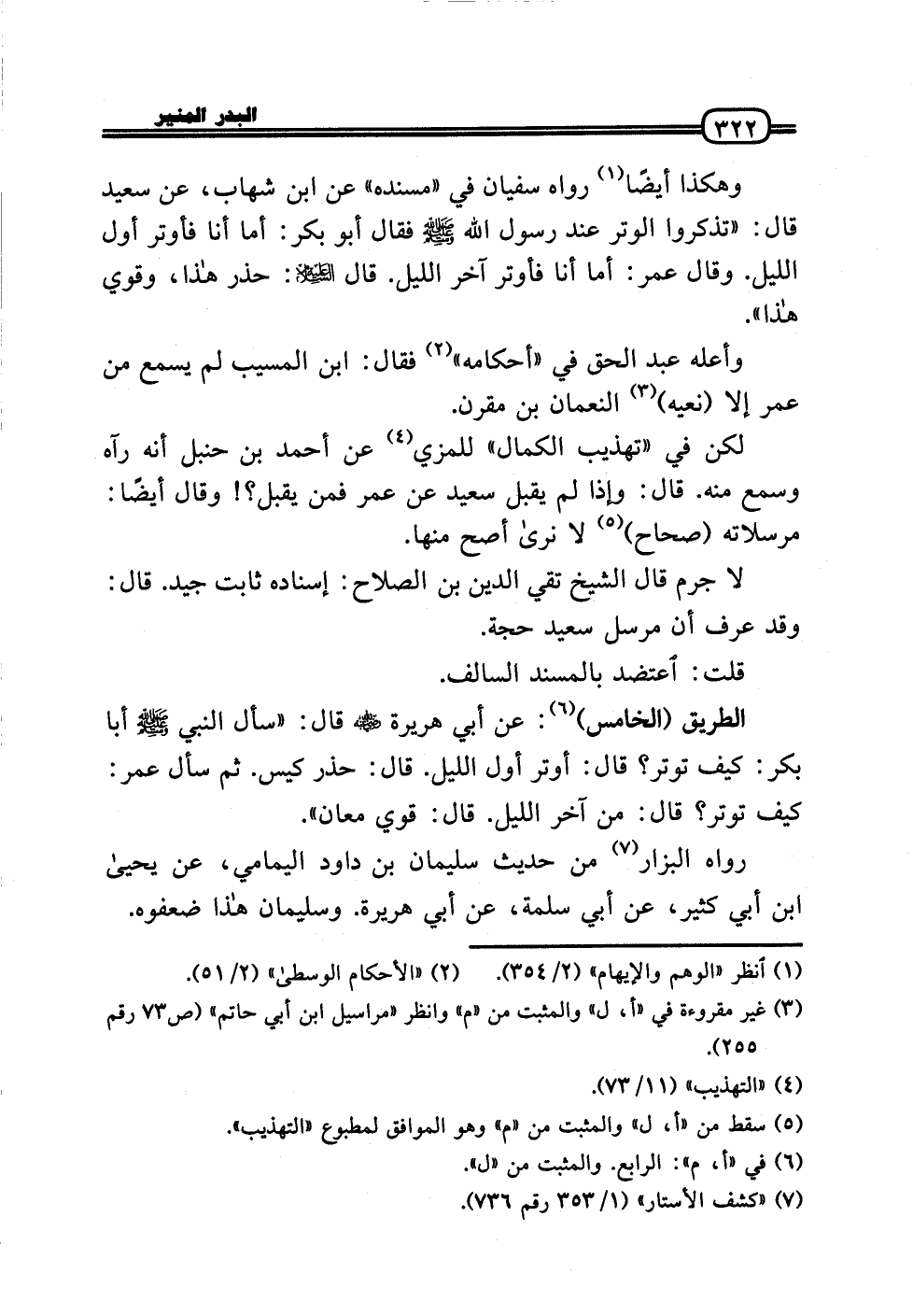 وَهَكَذَا أَيْضا رَوَاهُ سُفْيَان فِي «مُسْنده» عَن ابْن شهَاب، عَن سعيد قَالَ: (تَذكرُوا الْوتر عِنْد رَسُول الله - صَلَّى الله عَلَيْهِ وَسلم - فَقَالَ أَبُو بكر: أما أَنا فأوتر أول اللَّيْل. وَقَالَ عمر: أما أَنا فأوتر آخر اللَّيْل. قَالَ عَلَيْهِ السَّلَام: حذر هَذَا، وَقَوي هَذَا» .