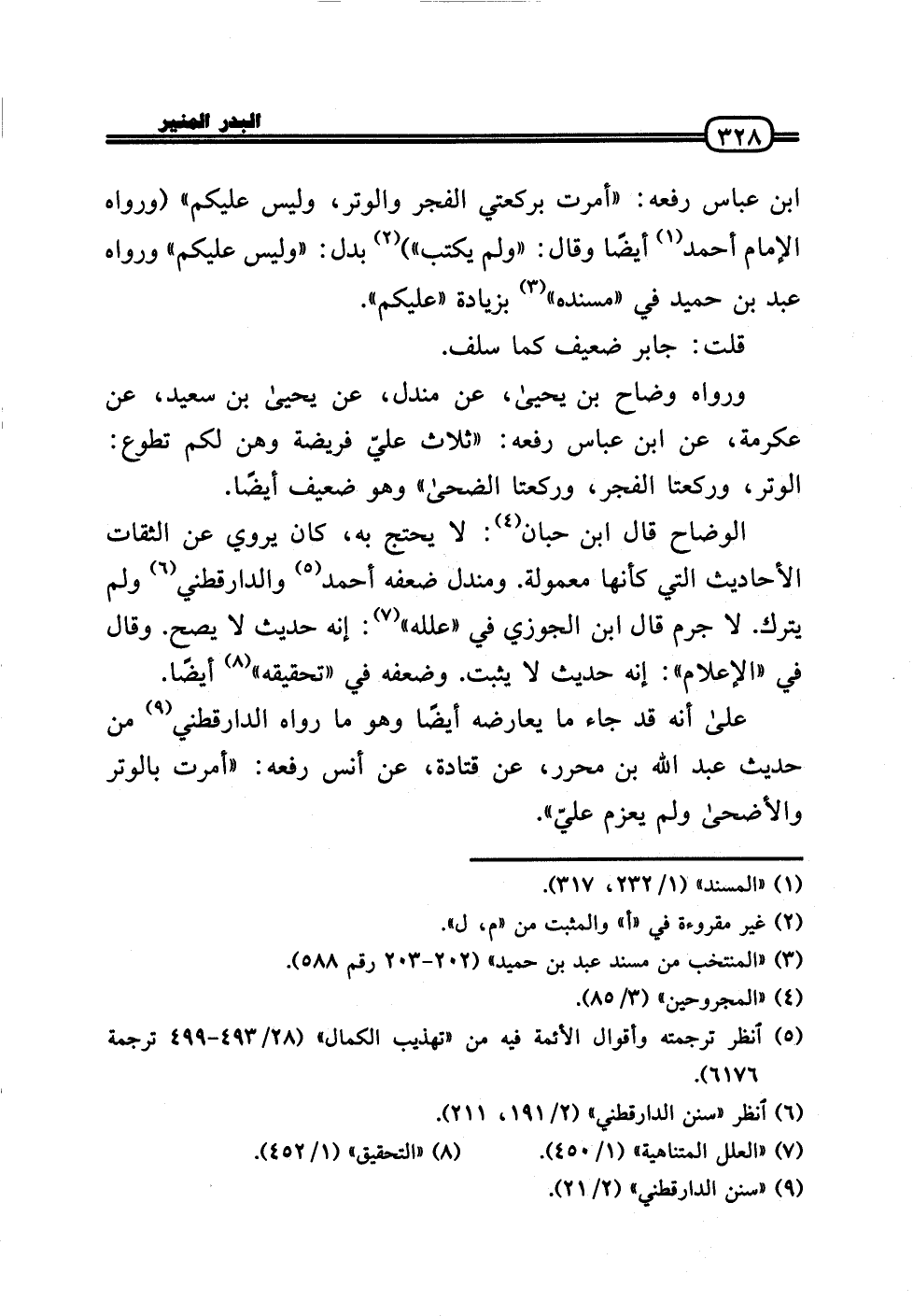 ابْن عَبَّاس رَفعه: «أمرت بركعتي الْفجْر وَالْوتر، وَلَيْسَ عَلَيْكُم» (وَرَوَاهُ الإِمَام أَحْمد أَيْضا وَقَالَ: «وَلم يكْتب» ) بدل: «وَلَيْسَ عَلَيْكُم» وَرَوَاهُ عبد بن حميد فِي «مُسْنده» بِزِيَادَة «عَلَيْكُم» .