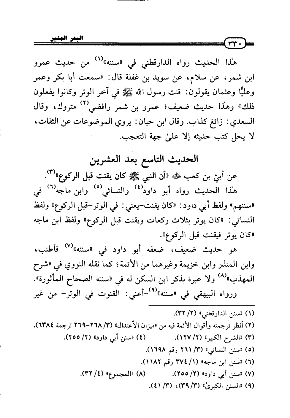 هَذَا الحَدِيث رَوَاهُ الدَّارَقُطْنِيّ فِي «سنَنه» من حَدِيث عَمْرو بن شمر، عَن سَلام، عَن سُوَيْد بن غَفلَة قَالَ: «سَمِعت أَبَا بكر وَعمر وعليًّا وَعُثْمَان يَقُولُونَ: قنت رَسُول الله - صَلَّى الله عَلَيْهِ وَسلم - فِي آخر الْوتر وَكَانُوا يَفْعَلُونَ ذَلِك» وَهَذَا حَدِيث ضَعِيف؛ عَمْرو بن شمر رَافِضِي مَتْرُوك، وَقَالَ السَّعْدِيّ: زائغ كَذَّاب. وَقَالَ ابْن حبَان: يروي الموضوعات عَن الثِّقَات، لَا يحل كتب حَدِيثه إِلَّا عَلَى جِهَة التَّعَجُّب.