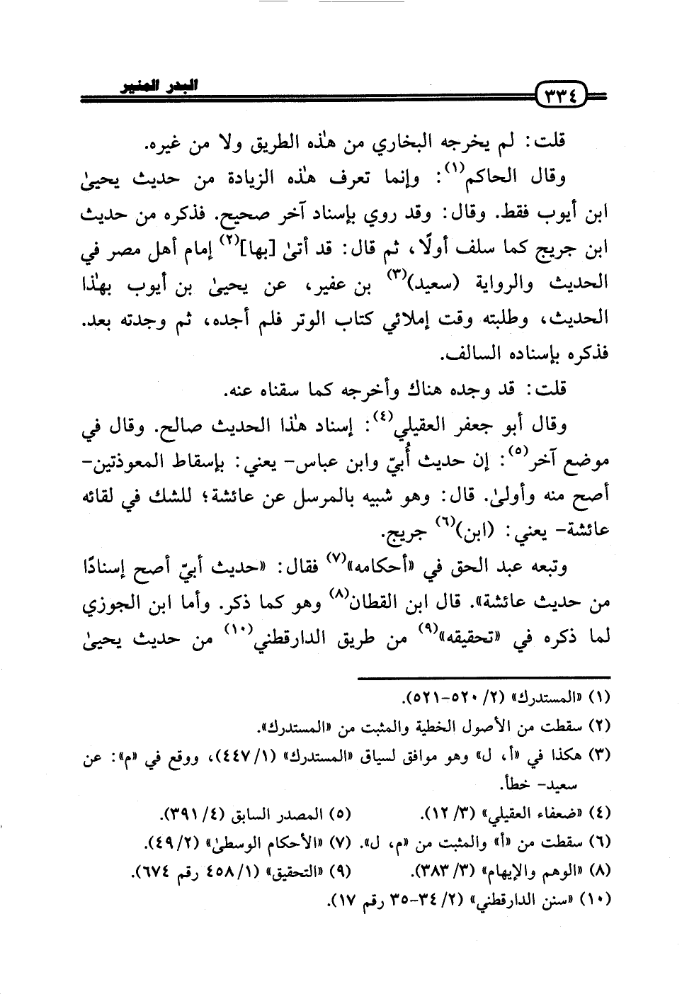 وَقَالَ الْحَاكِم: وَإِنَّمَا تعرف هَذِه الزِّيَادَة من حَدِيث يَحْيَى بن أَيُّوب فَقَط. وَقَالَ: وَقد رُوِيَ بِإِسْنَاد آخر صَحِيح. فَذكره من حَدِيث ابْن جريج كَمَا سلف أَولا، ثمَّ قَالَ: قد أَتَى [بهَا] إِمَام أهل مصر فِي الحَدِيث وَالرِّوَايَة (سعيد) بن عفير، عَن يَحْيَى بن أَيُّوب بِهَذَا الحَدِيث، وطلبته وَقت إملائي كتاب الْوتر فَلم أَجِدهُ، ثمَّ وجدته بعد. فَذكره بِإِسْنَادِهِ السالف.