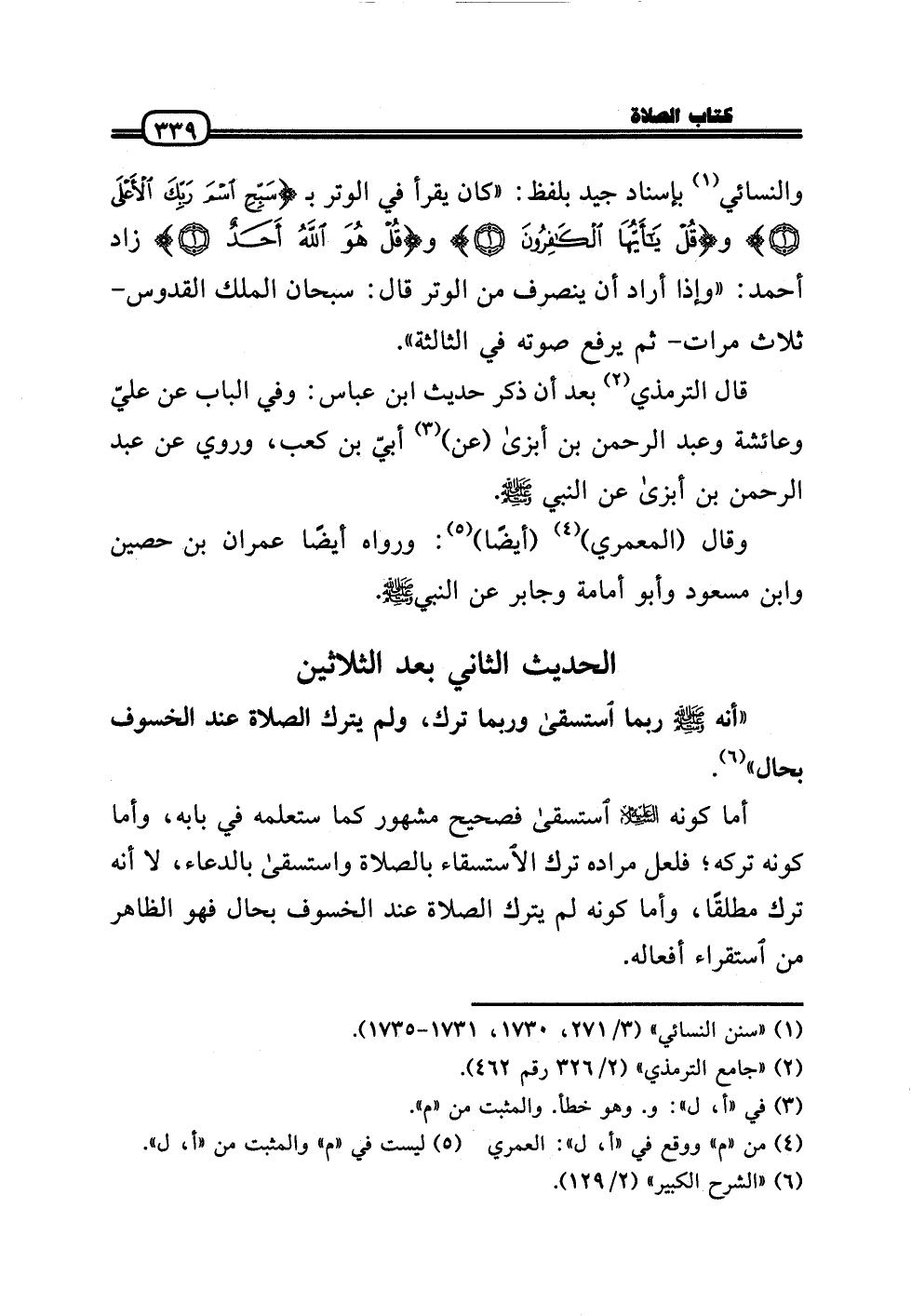 وَالنَّسَائِيّ بِإِسْنَاد جيد بِلَفْظ: «كَانَ يقْرَأ فِي الْوتر ب (سبح اسْم رَبك الْأَعْلَى (و (قل يَا أَيهَا الْكَافِرُونَ (و (قل هُوَ الله أحد (زَاد أَحْمد: «وَإِذا أَرَادَ أَن ينْصَرف من الْوتر قَالَ: سُبْحَانَ الْملك القدوس - ثَلَاث مَرَّات - ثمَّ يرفع صَوته فِي الثَّالِثَة» .