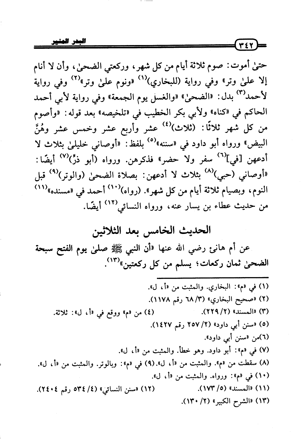 حَتَّى أَمُوت: صَوْم ثَلَاثَة أَيَّام من كل شهر، وركعتي الضُّحَى، وَأَن لَا أَنَام إِلَّا عَلَى وتر» وَفِي رِوَايَة (للْبُخَارِيّ) «ونوم عَلَى وتر» وَفِي رِوَايَة لِأَحْمَد بدل: «الضُّحَى» «وَالْغسْل يَوْم الْجُمُعَة» وَفِي رِوَايَة لأبي أَحْمد الْحَاكِم فِي «كناه» وَلأبي بكر الْخَطِيب فِي «تلخيصه» بعد قَوْله: «وَأَصُوم من كل شهر ثَلَاثًا: (ثَلَاث) عشر وَأَرْبع عشر وَخمْس عشر وهُنَّ الْبيض» وَرَوَاهُ أَبُو دَاوُد فِي «سنَنه» بِلَفْظ: «أَوْصَانِي خليلى بِثَلَاث لَا أدعهن [فِي] سفر وَلَا حضر» فَذَكرهنَّ. وَرَوَاهُ (أَبُو ذرٍّ) أَيْضا: «أَوْصَانِي (حبي) بِثَلَاث لَا أدعهن: بِصَلَاة الضُّحَى (وَالْوتر) قبل النّوم، وبصيام ثَلَاثَة أَيَّام من كل شهر» . (رَوَاهُ) أَحْمد فِي «مُسْنده» من حَدِيث عَطاء بن يسَار عَنهُ، وَرَوَاهُ النَّسَائِيّ أَيْضا.