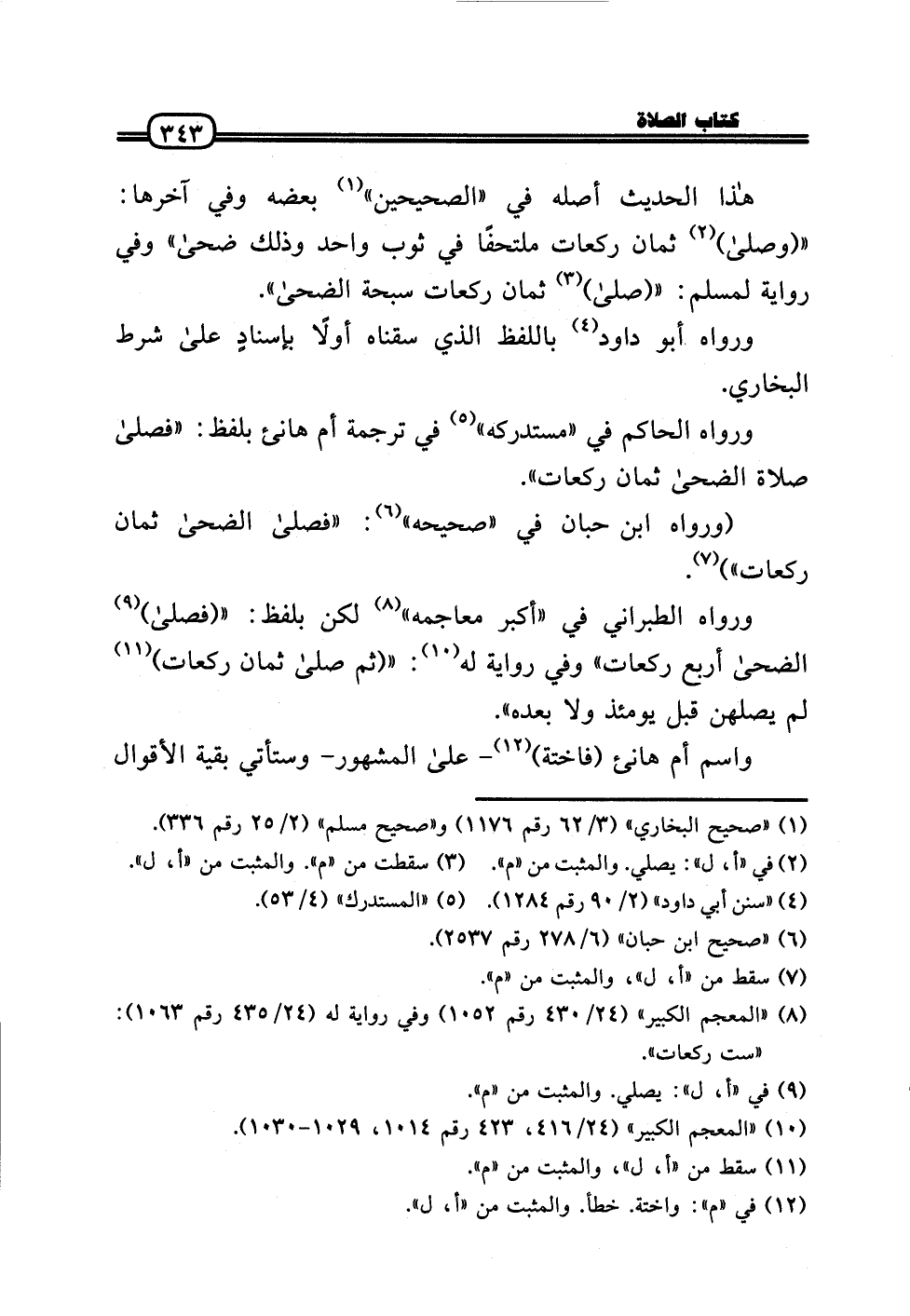 وَرَوَاهُ الطَّبَرَانِيّ فِي «أكبر معاجمه» لَكِن بِلَفْظ: « (فَصَلى) الضُّحَى أَربع رَكْعَات» وَفِي رِوَايَة لَهُ: « (ثمَّ صَلَّى ثَمَان رَكْعَات) لم يصلهن قبل يَوْمئِذٍ وَلَا بعده» .