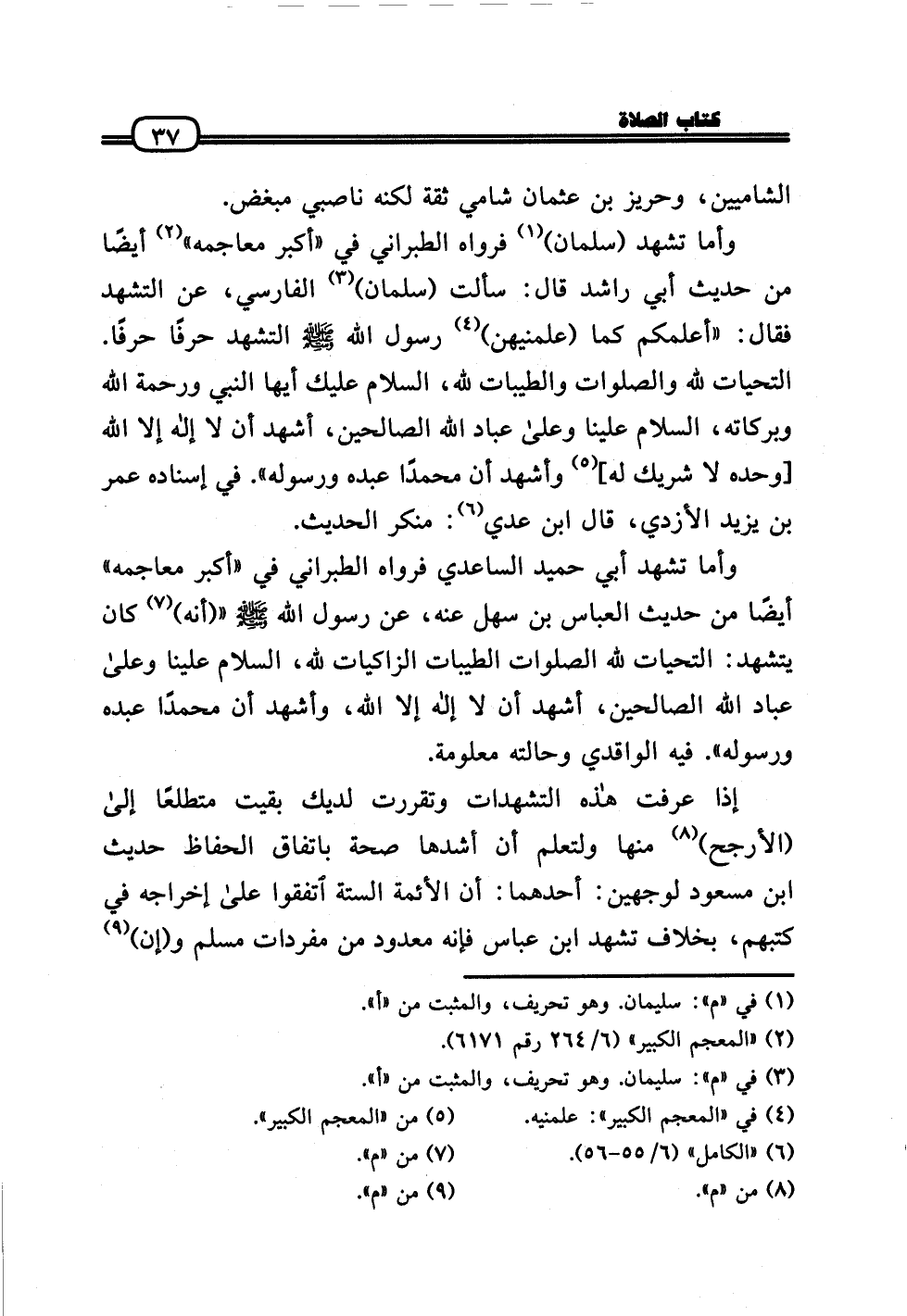 وَأما تشهد (سلمَان) فَرَوَاهُ الطَّبَرَانِيّ فِي «أكبر معاجمه» أَيْضا من حَدِيث أبي رَاشد قَالَ: سَأَلت (سلمَان) الْفَارِسِي، عَن التَّشَهُّد فَقَالَ: «أعلمكُم كَمَا (علمنيهن) رَسُول الله - صَلَّى الله عَلَيْهِ وَسلم - التَّشَهُّد حرفا حرفا. التَّحِيَّات لله والصلوات والطيبات لله، السَّلَام عَلَيْك أَيهَا النَّبِي وَرَحْمَة الله وَبَرَكَاته، السَّلَام علينا وَعَلَى عباد الله الصَّالِحين، أشهد أَن لَا إِلَه إِلَّا الله [وَحده لَا شريك لَهُ] وَأشْهد أَن مُحَمَّدًا عَبده وَرَسُوله» . فِي إِسْنَاده عمر بن يزِيد الْأَزْدِيّ، قَالَ ابْن عدي: مُنكر الحَدِيث.