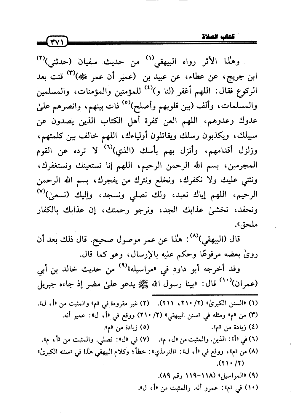 وَهَذَا الْأَثر رَوَاهُ الْبَيْهَقِيّ من حَدِيث سُفْيَان (حَدثنِي) ابْن جريج، عَن عَطاء، عَن عبيد بن (عُمَيْر أَن عمر رَضِيَ اللَّهُ عَنْه) قنت بعد الرُّكُوع فَقَالَ: اللَّهُمَّ اغْفِر (لنا و) للْمُؤْمِنين وَالْمُؤْمِنَات، وَالْمُسْلِمين وَالْمُسلمَات، وَألف (بَين قُلُوبهم وَأصْلح) ذَات بَينهم، وانصرهم عَلَى عَدوك وعدوهم، اللَّهُمَّ الْعَن كفرة أهل الْكتاب الَّذين يصدون عَن سَبِيلك، ويكذبون رسلك ويقاتلون أولياءك، اللَّهُمَّ خَالف بَين كلمتهم، وزلزل أَقْدَامهم، وَأنزل بهم بأسك (الَّذِي) لَا ترده عَن الْقَوْم الْمُجْرمين، بِسم الله الرَّحْمَن الرَّحِيم، اللَّهُمَّ إِنَّا نستعينك ونستغفرك، ونثني عَلَيْك وَلَا نكفرك، ونخلع ونترك من يفجرك، بِسم الله الرَّحْمَن الرَّحِيم، اللَّهُمَّ إياك نعْبد، وَلَك نصلي ونسجد، وَإِلَيْك (نسعى) ونحفد، نخشى عذابك الْجد، وَنَرْجُو رحمتك، إِن عذابك بالكفار مُلْحق» .