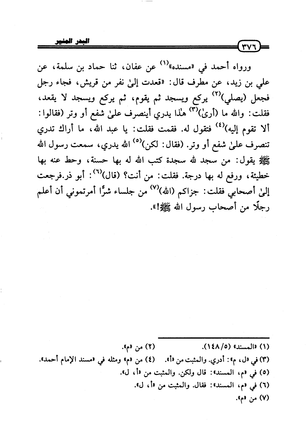 وَرَوَاهُ أَحْمد فِي «مُسْنده» عَن عَفَّان، ثَنَا حَمَّاد بن سَلمَة، عَن عَلّي بن زيد، عَن مطرف قَالَ: «قعدت إِلَى نفر من قُرَيْش، فجَاء رجل فَجعل (يُصَلِّي) يرْكَع وَيسْجد ثمَّ يقوم، ثمَّ يرْكَع وَيسْجد لَا يقْعد، فَقلت: وَالله مَا (أرَى) هَذَا يدْرِي أينصرف عَلَى شفع أَو وتر (فَقَالُوا: أَلا تقوم إِلَيْهِ) فَتَقول لَهُ. فَقُمْت فَقلت: يَا عبد الله، مَا أَرَاك تَدْرِي تَنْصَرِف عَلَى شفع أَو وتر. (فَقَالَ: لَكِن) الله يدْرِي، سَمِعت رَسُول الله - صَلَّى الله عَلَيْهِ وَسلم - يَقُول: من سجد لله سَجْدَة كتب الله لَهُ بهَا حَسَنَة، وَحط عَنهُ بهَا خَطِيئَة، وَرفع لَهُ بهَا دَرَجَة. فَقلت: من أَنْت؟ (قَالَ) : أَبُو ذَر. فَرَجَعت إِلَى أَصْحَابِي فَقلت: جزاكم (الله) من جلساء شرًّا أَمرْتُمُونِي أَن أعلم رجلا من أَصْحَاب رَسُول الله - صَلَّى الله عَلَيْهِ وَسلم -!» .