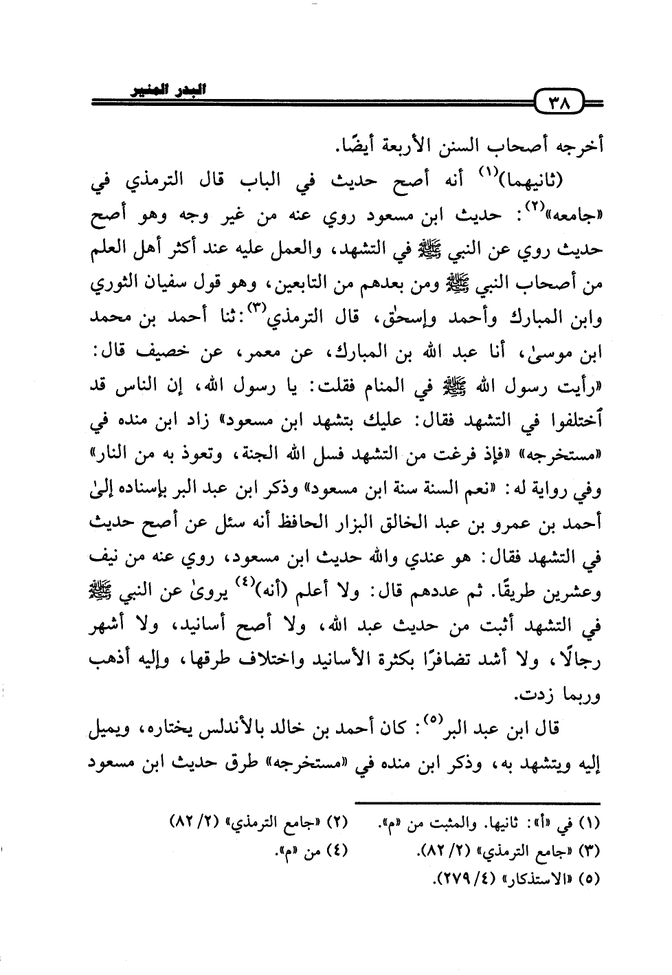 (ثَانِيهمَا) أَنه أصح حَدِيث فِي الْبَاب قَالَ التِّرْمِذِيّ فِي «جَامعه» : حَدِيث ابْن مَسْعُود رُوِيَ عَنهُ من غير وَجه وَهُوَ أصح حَدِيث رُوِيَ عَن النَّبِي - صَلَّى الله عَلَيْهِ وَسلم - فِي التَّشَهُّد، وَالْعَمَل عَلَيْهِ عِنْد أَكثر أهل الْعلم من أَصْحَاب النَّبِي - صَلَّى الله عَلَيْهِ وَسلم - وَمن بعدهمْ من التَّابِعين، وَهُوَ قَول سُفْيَان الثَّوْريّ وَابْن الْمُبَارك وَأحمد وَإِسْحَاق، قَالَ التِّرْمِذِيّ: ثَنَا أَحْمد بن مُحَمَّد بن مُوسَى، أَنا عبد الله بن الْمُبَارك، عَن معمر، عَن خصيف قَالَ: «رَأَيْت رَسُول الله - صَلَّى الله عَلَيْهِ وَسلم - فِي الْمَنَام فَقلت: يَا رَسُول الله، إِن النَّاس قد اخْتلفُوا فِي التَّشَهُّد فَقَالَ: عَلَيْك بتشهد ابْن مَسْعُود» زَاد ابْن مَنْدَه فِي «مستخرجه» «فَإذْ فرغت من التَّشَهُّد فسل الله الْجنَّة، وتعوذ بِهِ من النَّار» وَفِي رِوَايَة لَهُ: «نعم السّنة سنة ابْن مَسْعُود» وَذكر ابْن عبد الْبر بِإِسْنَادِهِ إِلَى أَحْمد بن عَمْرو بن عبد الْخَالِق الْبَزَّار الْحَافِظ أَنه سُئِلَ عَن أصح حَدِيث فِي التَّشَهُّد فَقَالَ: هُوَ عِنْدِي وَالله حَدِيث ابْن مَسْعُود، رُوِيَ عَنهُ من نَيف وَعشْرين طَرِيقا. ثمَّ عَددهمْ قَالَ: وَلَا أعلم (أَنه) يرْوَى عَن النَّبِي - صَلَّى الله عَلَيْهِ وَسلم - فِي التَّشَهُّد أثبت من حَدِيث عبد الله، وَلَا أصح أَسَانِيد، وَلَا أشهر رجَالًا، وَلَا أَشد تضافرًا بِكَثْرَة الْأَسَانِيد وَاخْتِلَاف طرقها، وَإِلَيْهِ أذهب وَرُبمَا زِدْت.