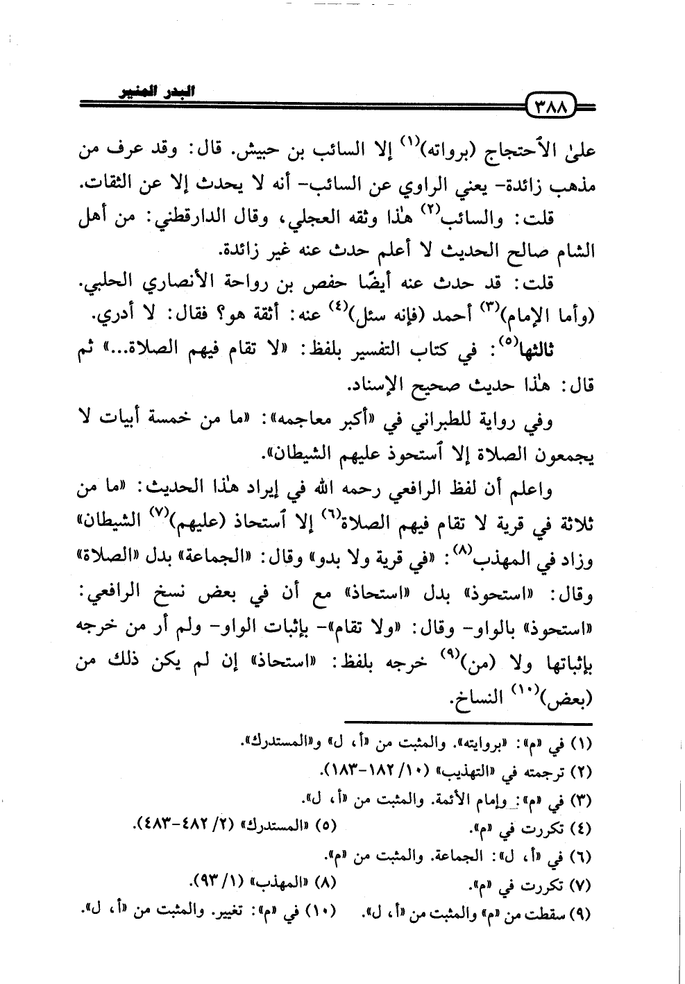 وَاعْلَم أَن لفظ الرَّافِعِيّ رَحِمَهُ اللَّهُ فِي إِيرَاد هَذَا الحَدِيث: «مَا من ثَلَاثَة فِي قَرْيَة لَا تُقَام فيهم الصَّلَاة إِلَّا استحاذ (عَلَيْهِم) الشَّيْطَان» وَزَاد فِي الْمُهَذّب: «فِي قَرْيَة وَلَا بَدو» وَقَالَ: «الْجَمَاعَة» بدل «الصَّلَاة» وَقَالَ: «استحوذ» بدل «استحاذ» مَعَ أَن فِي بعض نسخ الرَّافِعِيّ: «استحوذ» بِالْوَاو - وَقَالَ: «وَلَا تُقَام» - بِإِثْبَات الْوَاو - وَلم أر من خرجه بإثباتها وَلَا (من) خرجه بِلَفْظ: «استحاذ» إِن لم يكن ذَلِك من (بعض) النساخ.