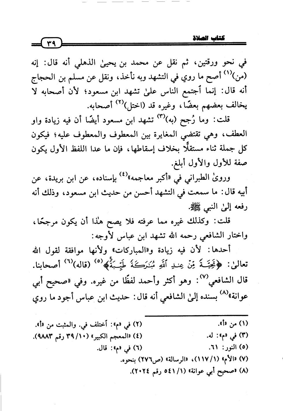 فِي نَحْو ورقتين، ثمَّ نقل عَن مُحَمَّد بن يَحْيَى الذهلي أَنه قَالَ: إِنَّه (من) أصح مَا رُوِيَ فِي التَّشَهُّد وَبِه نَأْخُذ، وَنقل عَن مُسلم بن الْحجَّاج أَنه قَالَ: إِنَّمَا اجْتمع النَّاس عَلَى تشهد ابْن مَسْعُود؛ لِأَن أَصْحَابه لَا يُخَالف بَعضهم بَعْضًا، وَغَيره قد (اخْتَلَّ) أَصْحَابه.
