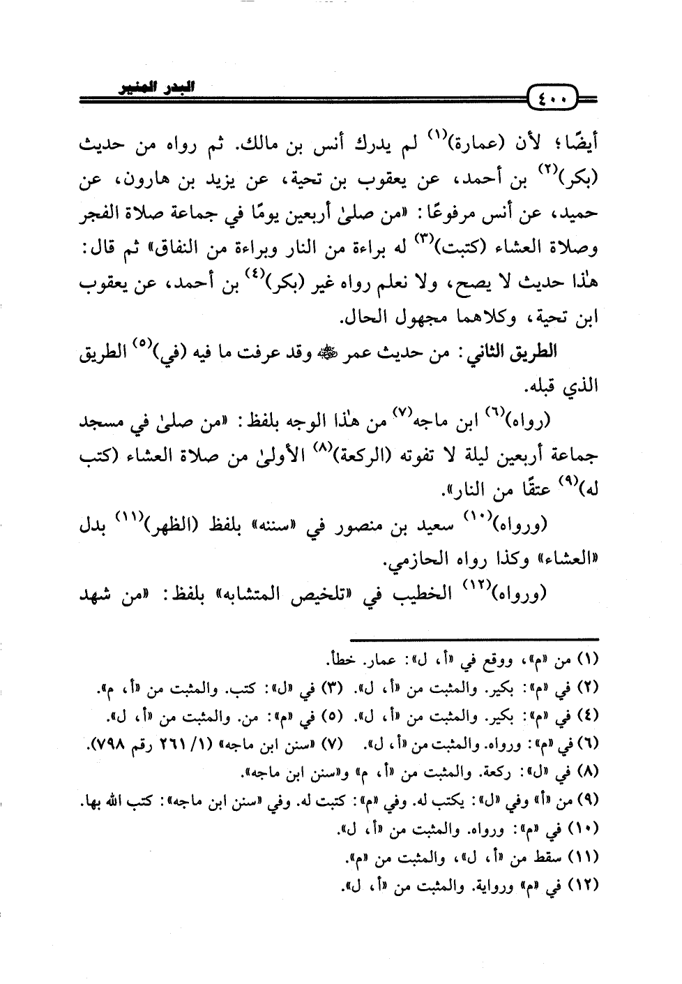 أَيْضا؛ لِأَن (عمَارَة) لم يدْرك أنس بن مَالك. ثمَّ رَوَاهُ من حَدِيث (بكر) بن أَحْمد، عَن يَعْقُوب بن تَحِيَّة، عَن يزِيد بن هَارُون، عَن حميد، عَن أنس مَرْفُوعا: «من صَلَّى أَرْبَعِينَ يَوْمًا فِي جمَاعَة صَلَاة الْفجْر وَصَلَاة الْعشَاء (كتبت) لَهُ بَرَاءَة من النَّار وَبَرَاءَة من النِّفَاق» ثمَّ قَالَ: هَذَا حَدِيث لَا يَصح، وَلَا نعلم رَوَاهُ غير (بكر) بن أَحْمد، عَن يَعْقُوب بن تَحِيَّة، وَكِلَاهُمَا مَجْهُول الْحَال.