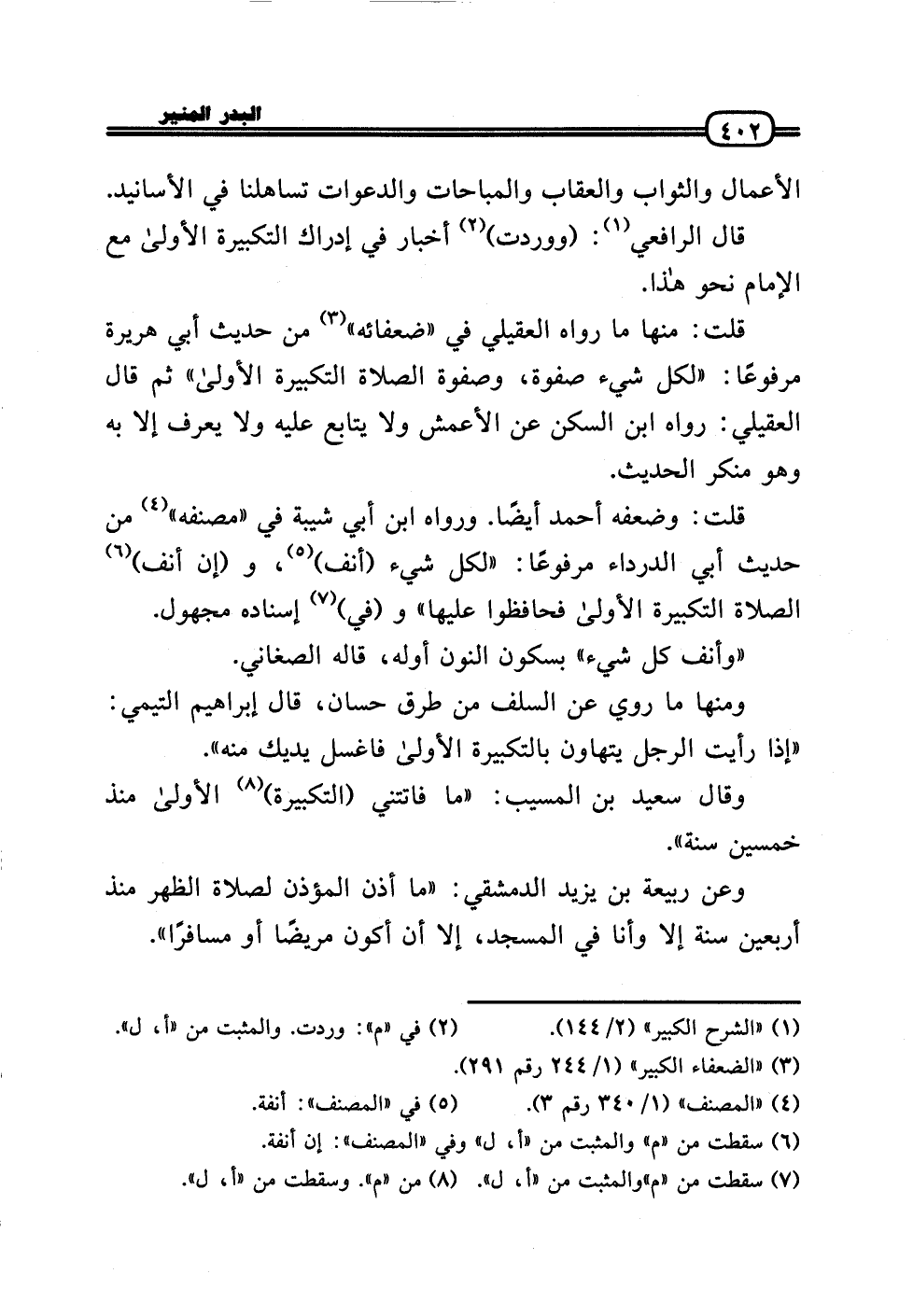قَالَ الرَّافِعِيّ: (ووردت) أَخْبَار فِي إِدْرَاك التَّكْبِيرَة الأولَى مَعَ الإِمَام نَحْو هَذَا.