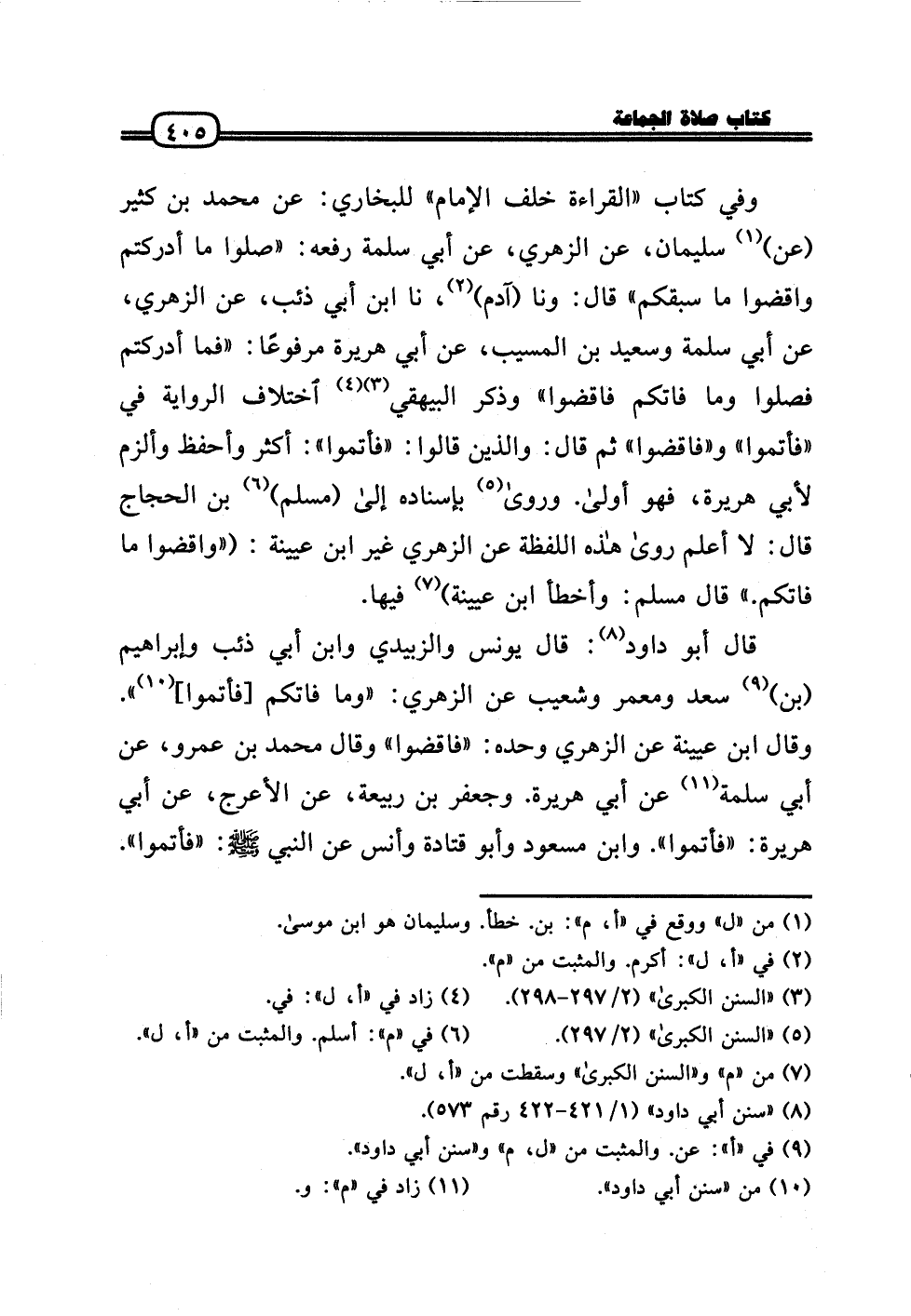 وَفِي كتاب «الْقِرَاءَة خلف الإِمَام» للْبُخَارِيّ: عَن مُحَمَّد بن كثير (عَن) سُلَيْمَان، عَن الزُّهْرِيّ، عَن أبي سَلمَة رَفعه: «صلوا مَا أدركتم واقضوا مَا سبقكم» قَالَ: ونا (آدم) ، نَا ابْن أبي ذِئْب، عَن الزُّهْرِيّ، عَن أبي سَلمَة وَسَعِيد بن الْمسيب، عَن أبي هُرَيْرَة مَرْفُوعا: «فَمَا أدركتم فصلوا وَمَا فاتكم فاقضوا» وَذكر الْبَيْهَقِيّ اخْتِلَاف الرِّوَايَة فِي «فَأتمُّوا» و «فاقضوا» ثمَّ قَالَ: وَالَّذين قَالُوا: «فَأتمُّوا» : أَكثر وأحفظ وألزم لأبي هُرَيْرَة، فَهُوَ أولَى. وَرَوَى بِإِسْنَادِهِ إِلَى (مُسلم) بن الْحجَّاج قَالَ: لَا أعلم رَوَى هَذِه اللَّفْظَة عَن الزُّهْرِيّ غير ابْن عُيَيْنَة: « (واقضوا مَا فاتكم.» قَالَ مُسلم: وَأَخْطَأ ابْن عُيَيْنَة) فِيهَا.