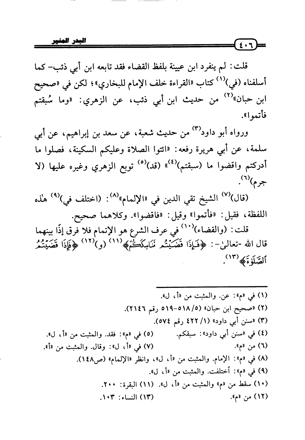 قلت: لم ينْفَرد ابْن عُيَيْنَة بِلَفْظ الْقَضَاء فقد تَابعه ابْن أبي ذِئْب - كَمَا أسلفناه (فِي) كتاب «الْقِرَاءَة خلف الإِمَام للْبُخَارِيّ» ؛ لَكِن فِي «صَحِيح ابْن حبَان» من حَدِيث ابْن أبي ذِئْب، عَن الزُّهْرِيّ: «وَمَا سُبقتم فَأتمُّوا» .