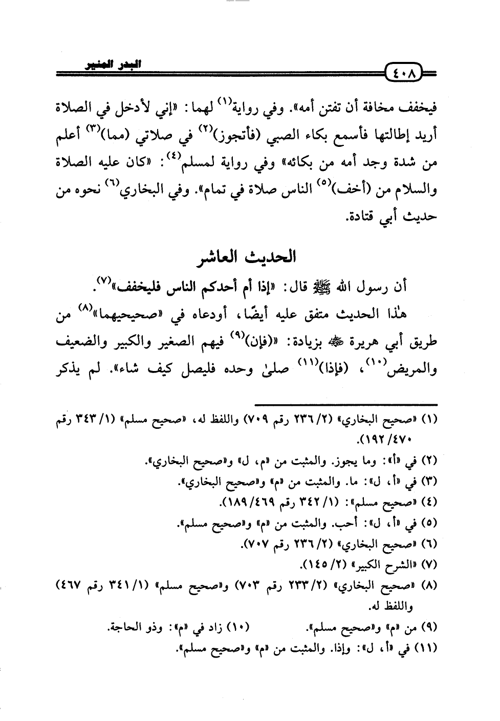 فيخفف مَخَافَة أَن تفتن أمه» . وَفِي رِوَايَة لَهما: «إِنِّي لأدخل فِي الصَّلَاة أُرِيد إطالتها فَأَسْمع بكاء الصَّبِي (فأتجوز) فِي صَلَاتي (مِمَّا) أعلم من شدَّة وجد أمه من بكائه» وَفِي رِوَايَة لمُسلم: «كَانَ عَلَيْهِ الصَّلَاة وَالسَّلَامُ من (أخف) النَّاس صَلَاة فِي تَمام» . وَفِي البُخَارِيّ نَحوه من حَدِيث أبي قَتَادَة.