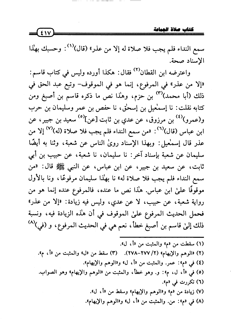 وَاعْتَرضهُ ابْن الْقطَّان فَقَالَ: هَكَذَا أوردهُ وَلَيْسَ فِي كتاب قَاسم: «إِلَّا من عذر» فِي الْمَرْفُوع، إِنَّمَا هُوَ فِي الْمَوْقُوف - وَتبع عبد الْحق فِي ذَلِك (أَبَا مُحَمَّد) بن حزم، وَهَذَا نَص مَا ذكره قَاسم بن أصبغ وَمن كِتَابه نقلت: نَا إِسْمَاعِيل بن إِسْحَاق، نَا حَفْص بن عمر وَسليمَان بن حَرْب و (عَمْرو) بن مَرْزُوق، عَن عدي بن ثَابت [عَن] سعيد بن جُبَير، عَن ابْن عَبَّاس (قَالَ) : «من سمع النداء فَلم يجب فَلَا صَلَاة (لَهُ) إِلَّا من عذر قَالَ إِسْمَاعِيل: وَبِهَذَا الْإِسْنَاد رَوَى النَّاس عَن شُعْبَة، وثنا بِهِ أَيْضا سُلَيْمَان عَن شُعْبَة بِإِسْنَاد آخر: نَا سُلَيْمَان، نَا شُعْبَة، عَن حبيب بن أبي ثَابت، عَن سعيد بن جُبَير، عَن ابْن عَبَّاس، عَن النَّبِي - صَلَّى الله عَلَيْهِ وَسلم - قَالَ: «من سمع النداء فَلم يجب فَلَا صَلَاة لَهُ» نَا بِهَذَا سُلَيْمَان مَرْفُوعا، ونا بِالْأولِ مَوْقُوفا عَلَى ابْن عَبَّاس. هَذَا نَص مَا عِنْده، فَالْمَرْفُوع عِنْده إِنَّمَا هُوَ من رِوَايَة شُعْبَة، عَن حبيب، لَا عَن عدي، وَلَيْسَ فِيهِ زِيَادَة: «إِلَّا من عذر» فَحمل الحَدِيث الْمَرْفُوع عَلَى الْمَوْقُوف فِي أَن هَذِه الزِّيَادَة فِيهِ، وَنسبَة ذَلِك إِلَى قَاسم بن أصبغ خطأ، نعم هِيَ فِي الحَدِيث الْمَرْفُوع، و (فِي)