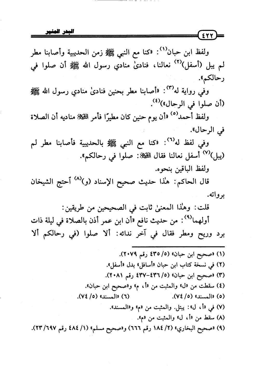 وَلَفظ ابْن حبَان: «كُنَّا مَعَ النَّبِي - صَلَّى الله عَلَيْهِ وَسلم - زمن الْحُدَيْبِيَة وأصابنا مطر لم يبل (أَسْفَل) نعالنا، فَنَادَى مُنَادِي رَسُول الله - صَلَّى الله عَلَيْهِ وَسلم - أَن صلوا فِي رحالكُمْ» .