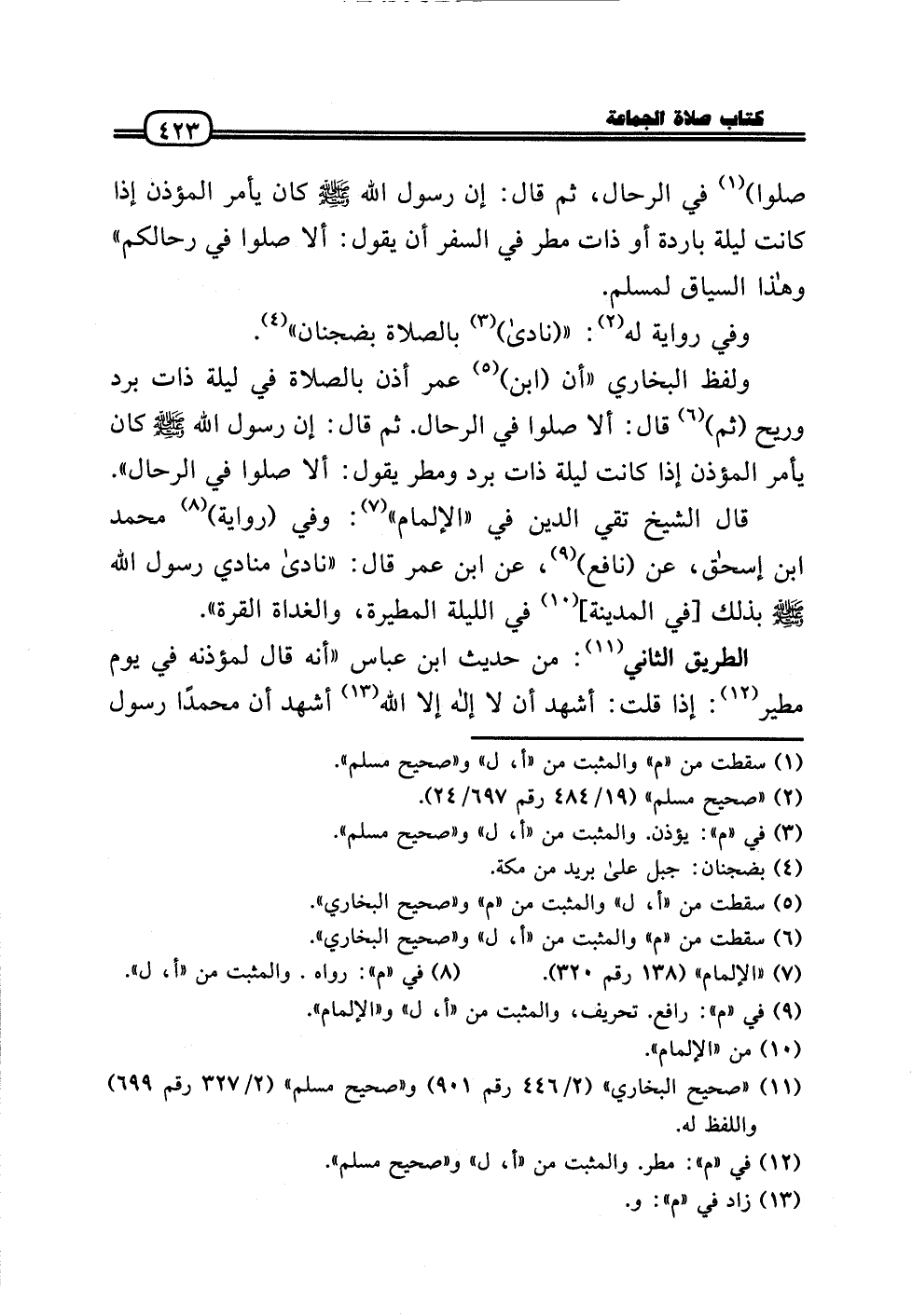 قَالَ الشَّيْخ تَقِيّ الدَّين فِي «الْإِلْمَام» : وَفِي (رِوَايَة) مُحَمَّد بن إِسْحَاق، عَن (نَافِع) ، عَن ابْن عمر قَالَ: «نَادَى مُنَادِي رَسُول الله - صَلَّى الله عَلَيْهِ وَسلم - بذلك [فِي الْمَدِينَة] فِي اللَّيْلَة الْمَطِيرَة، والغداة القرة» .