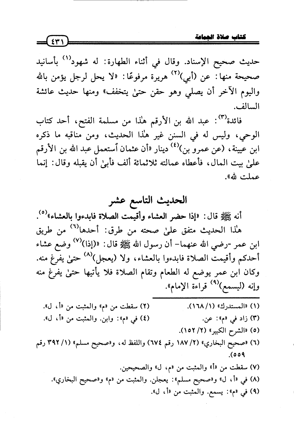 هَذَا الحَدِيث مُتَّفق عَلَى صِحَّته من طرق: أَحدهَا من طَرِيق ابْن عمر - رَضِيَ اللَّهُ عَنْهما - أَن رَسُول الله - صَلَّى الله عَلَيْهِ وَسلم - قَالَ: « (إِذا) وضع عشَاء أحدكُم وأقيمت الصَّلَاة فابدءوا بالعشاء، وَلَا (يعجل) حَتَّى يفرغ مِنْهُ. وَكَانَ ابْن عمر يوضع لَهُ الطَّعَام وتقام الصَّلَاة فَلَا يَأْتِيهَا حَتَّى يفرغ مِنْهُ وَإنَّهُ (ليسمع) قِرَاءَة الإِمَام» .