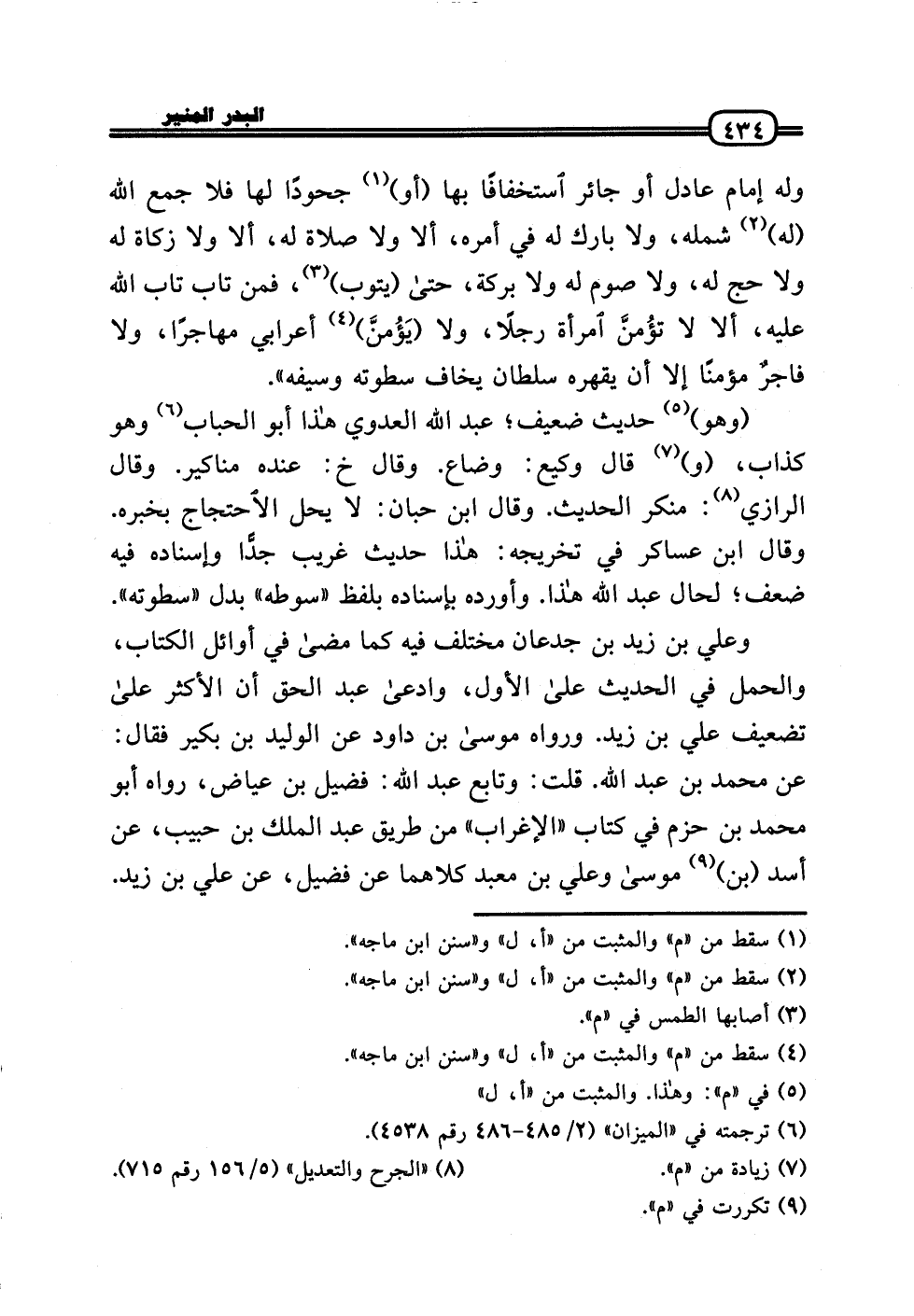 وَعلي بن زيد بن جدعَان مُخْتَلف فِيهِ كَمَا مَضَى فِي أَوَائِل الْكتاب، وَالْحمل فِي الحَدِيث عَلَى الأول، وَادَّعَى عبد الْحق أَن الْأَكْثَر عَلَى تَضْعِيف عَلّي بن زيد. وَرَوَاهُ مُوسَى بن دَاوُد عَن الْوَلِيد بن بكير فَقَالَ: عَن مُحَمَّد بن عبد الله. قلت: وتابع عبد الله: فُضَيْل بن عِيَاض، رَوَاهُ أَبُو مُحَمَّد بن حزم فِي كتاب «الإغراب» من طَرِيق عبد الْملك بن حبيب، عَن أَسد (بن) مُوسَى وَعلي بن معبد كِلَاهُمَا عَن فُضَيْل، عَن عَلّي بن زيد.
