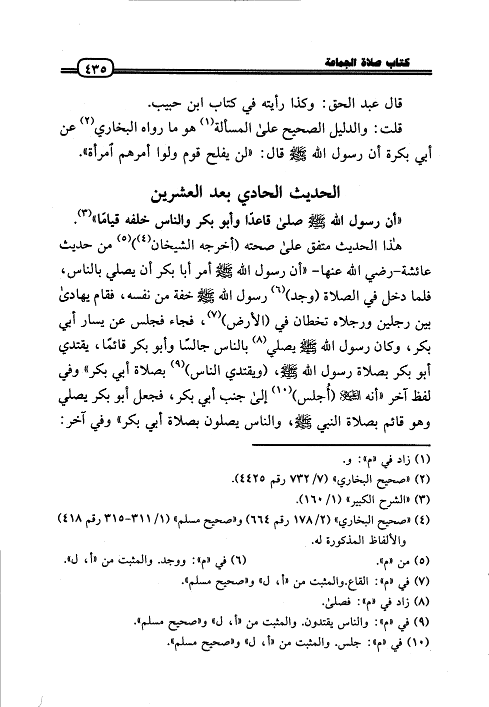 هَذَا الحَدِيث مُتَّفق عَلَى صِحَّته (أخرجه الشَّيْخَانِ) من حَدِيث عَائِشَة - رَضِيَ اللَّهُ عَنْها - «أَن رَسُول الله - صَلَّى الله عَلَيْهِ وَسلم - أَمر أَبَا بكر أَن يُصَلِّي بِالنَّاسِ، فَلَمَّا دخل فِي الصَّلَاة (وجد) رَسُول الله - صَلَّى الله عَلَيْهِ وَسلم - خفَّة من نَفسه، فَقَامَ يهادى بَين رجلَيْنِ وَرجلَاهُ تخطان فِي (الأَرْض) ، فجَاء فَجَلَسَ عَن يسَار أبي بكر، وَكَانَ رَسُول الله - صَلَّى الله عَلَيْهِ وَسلم - يُصَلِّي بِالنَّاسِ جَالِسا وَأَبُو بكر قَائِما، يَقْتَدِي أَبُو بكر بِصَلَاة رَسُول الله - صَلَّى الله عَلَيْهِ وَسلم -، (ويقتدي النَّاس) بِصَلَاة أبي بكر» وَفِي لفظ آخر «أَنه عَلَيْهِ السَّلَام (أُجلس) إِلَى جنب أبي بكر، فَجعل أَبُو بكر يُصَلِّي وَهُوَ قَائِم بِصَلَاة النَّبِي - صَلَّى الله عَلَيْهِ وَسلم -، وَالنَّاس يصلونَ بِصَلَاة أبي بكر» وَفِي آخر: