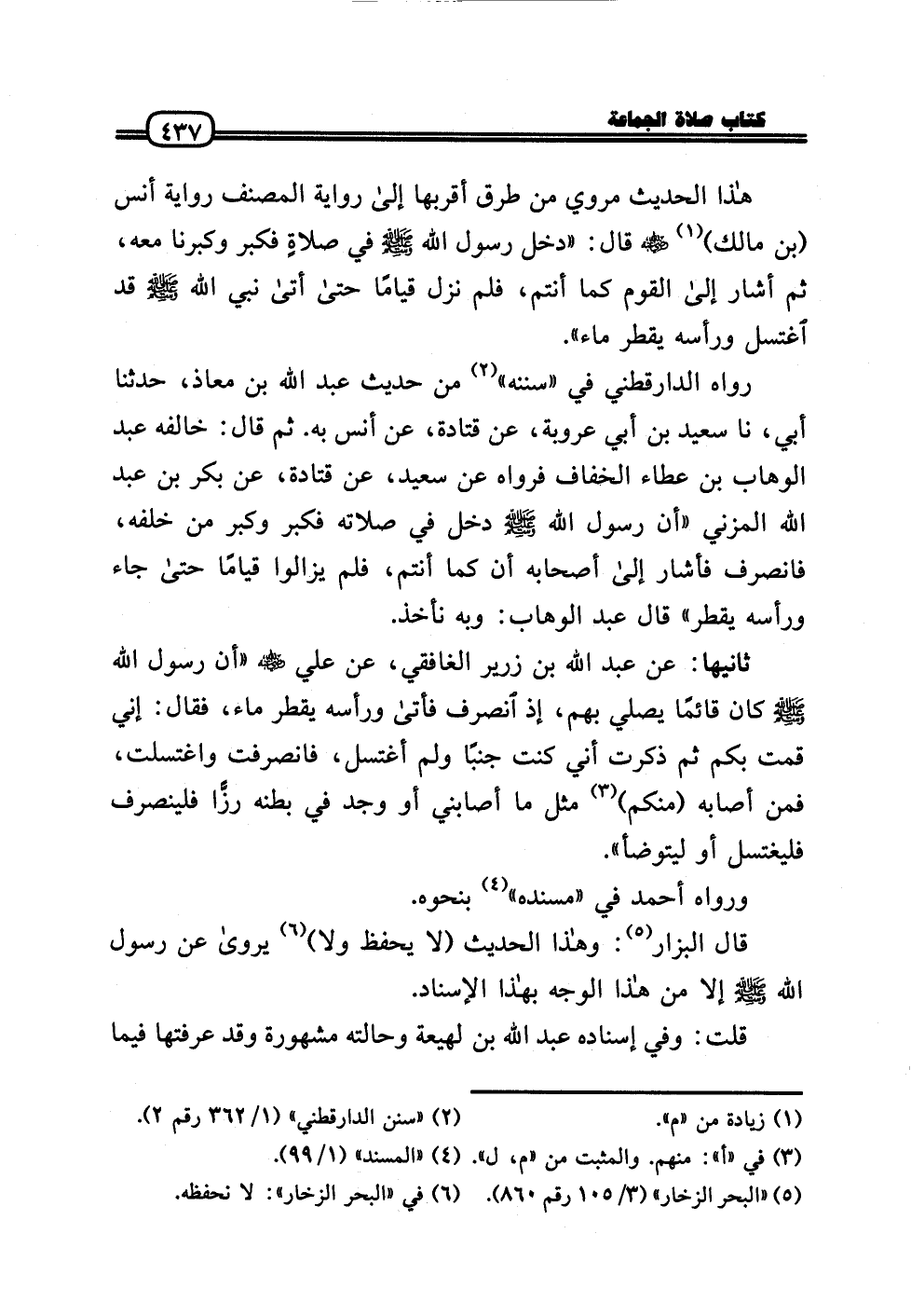 رَوَاهُ الدَّارَقُطْنِيّ فِي «سنَنه» من حَدِيث عبد الله بن معَاذ، حَدثنَا أبي، نَا سعيد بن أبي عرُوبَة، عَن قَتَادَة، عَن أنس بِهِ. ثمَّ قَالَ: خَالفه عبد الْوَهَّاب بن عَطاء الْخفاف فَرَوَاهُ عَن سعيد، عَن قَتَادَة، عَن بكر بن عبد الله الْمُزنِيّ «أَن رَسُول الله - صَلَّى الله عَلَيْهِ وَسلم - دخل فِي صلَاته فَكبر وَكبر من خَلفه، فَانْصَرف فَأَشَارَ إِلَى أَصْحَابه أَن كَمَا أَنْتُم، فَلم يزَالُوا قيَاما حَتَّى جَاءَ وَرَأسه يقطر» قَالَ عبد الْوَهَّاب: وَبِه نَأْخُذ.