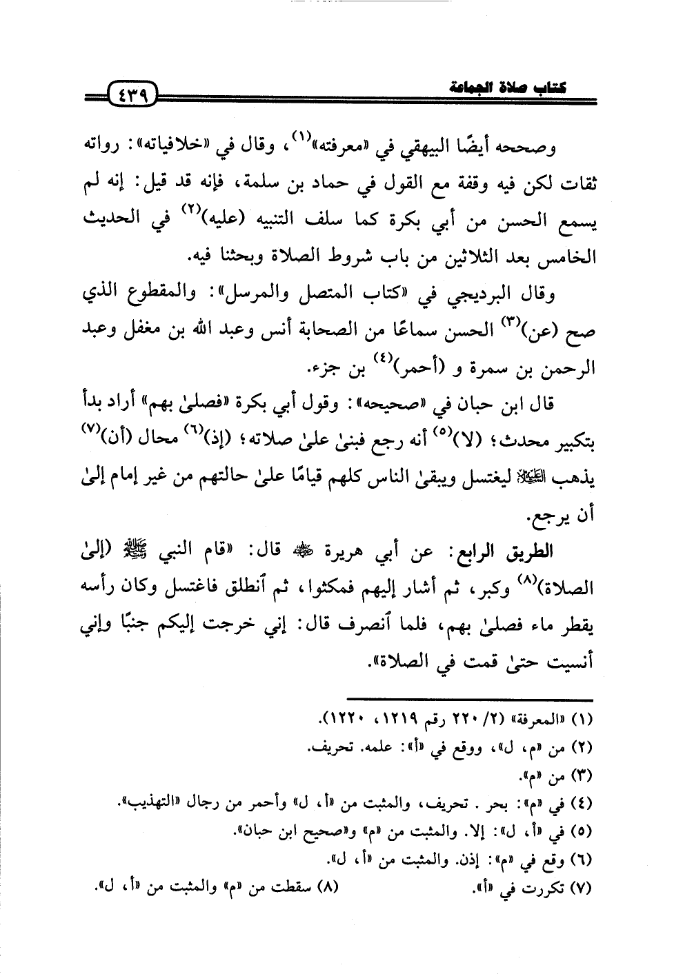 وَصَححهُ أَيْضا الْبَيْهَقِيّ فِي «مَعْرفَته» ، وَقَالَ فِي «خلافياته» : رُوَاته ثِقَات لَكِن فِيهِ وَقْفَة مَعَ القَوْل فِي حَمَّاد بن سَلمَة، فَإِنَّهُ قد قيل: إِنَّه لم يسمع الْحسن من أبي بكرَة كَمَا سلف التَّنْبِيه (عَلَيْهِ) فِي الحَدِيث الْخَامِس بعد الثَّلَاثِينَ من بَاب شُرُوط الصَّلَاة وبحثنا فِيهِ.