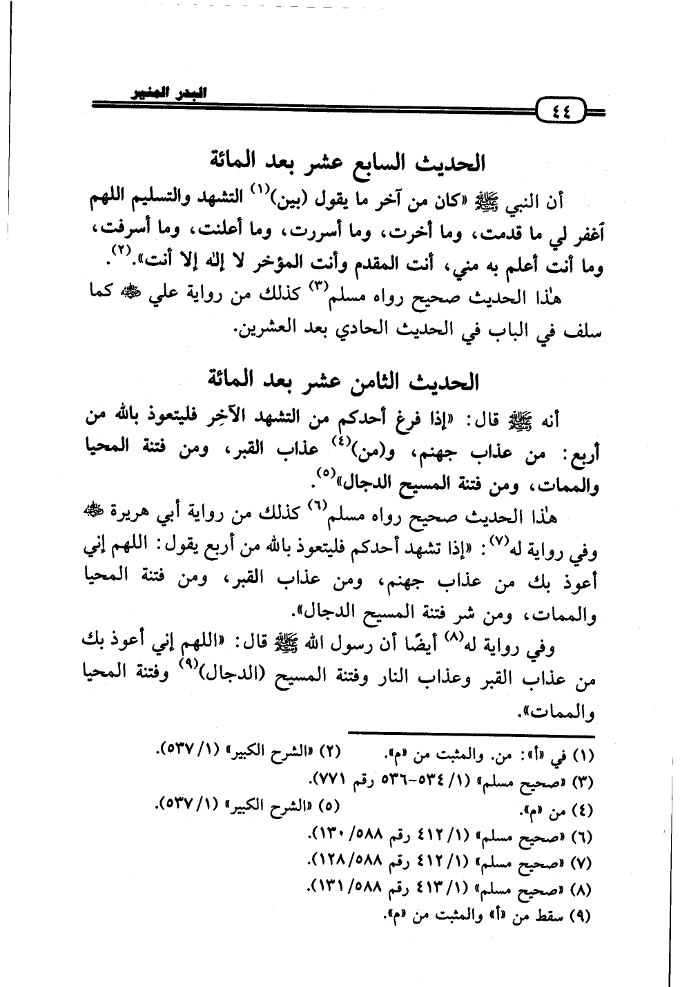 أَن النَّبِي - صَلَّى الله عَلَيْهِ وَسلم - «كَانَ من آخر مَا يَقُول (بَين) التَّشَهُّد وَالتَّسْلِيم اللَّهُمَّ اغْفِر لي مَا قدمت، وَمَا أخرت، وَمَا أسررت، وَمَا أعلنت، وَمَا أسرفت، وَمَا أَنْت أعلم بِهِ مني، أَنْت الْمُقدم وَأَنت الْمُؤخر لَا إِلَه إِلَّا أَنْت» . .