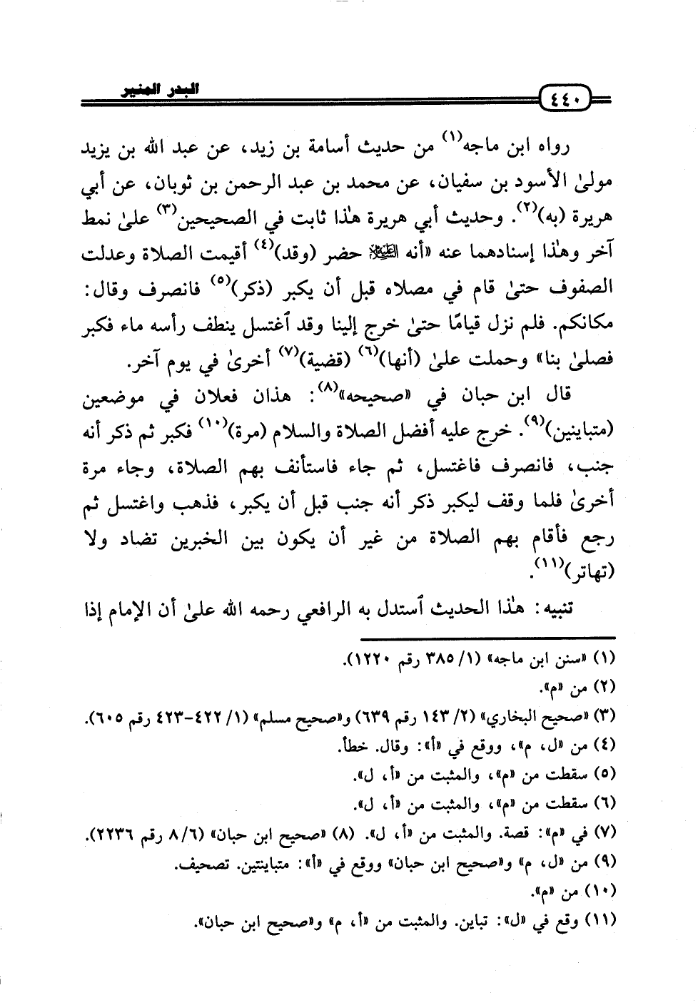 رَوَاهُ ابْن مَاجَه من حَدِيث أُسَامَة بن زيد، عَن عبد الله بن يزِيد مولَى الْأسود بن سُفْيَان، عَن مُحَمَّد بن عبد الرَّحْمَن بن ثَوْبَان، عَن أبي هُرَيْرَة (بِهِ) . وَحَدِيث أبي هُرَيْرَة هَذَا ثَابت فِي الصَّحِيحَيْنِ عَلَى نمط آخر وَهَذَا إسنادهما عَنهُ «أَنه عَلَيْهِ السَّلَام حضر (وَقد) أُقِيمَت الصَّلَاة وَعدلت الصُّفُوف حَتَّى قَامَ فِي مُصَلَّاهُ قبل أَن يكبر (ذكر) فَانْصَرف وَقَالَ: مَكَانكُمْ. فَلم نزل قيَاما حَتَّى خرج إِلَيْنَا وَقد اغْتسل ينطف رَأسه مَاء فَكبر فَصَلى بِنَا» وحملت عَلَى (أَنَّهَا) (قَضِيَّة) أُخْرَى فِي يَوْم آخر.