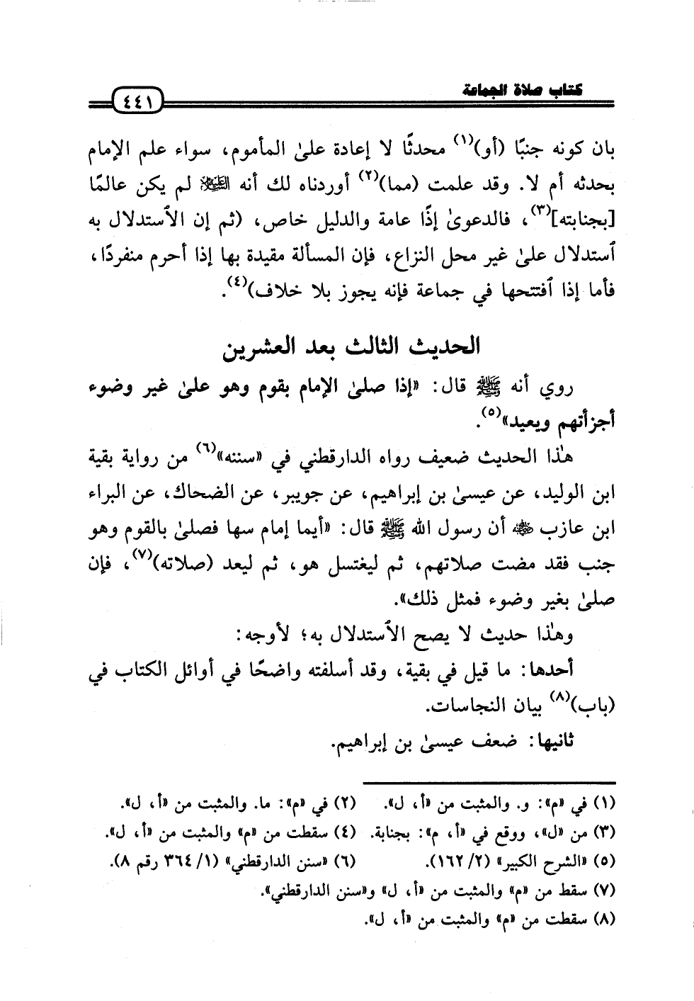 هَذَا الحَدِيث ضَعِيف رَوَاهُ الدَّارَقُطْنِيّ فِي «سنَنه» من رِوَايَة بَقِيَّة بن الْوَلِيد، عَن عِيسَى بن إِبْرَاهِيم، عَن جُوَيْبِر، عَن الضَّحَّاك، عَن الْبَراء بن عَازِب رَضِيَ اللَّهُ عَنْه أَن رَسُول الله - صَلَّى الله عَلَيْهِ وَسلم - قَالَ: «أَيّمَا إِمَام سَهَا فَصَلى بالقوم وَهُوَ جنب فقد مَضَت صلَاتهم، ثمَّ ليغتسل هُوَ، ثمَّ ليعد (صلَاته) ، فَإِن صَلَّى بِغَيْر وضوء فَمثل ذَلِك» .