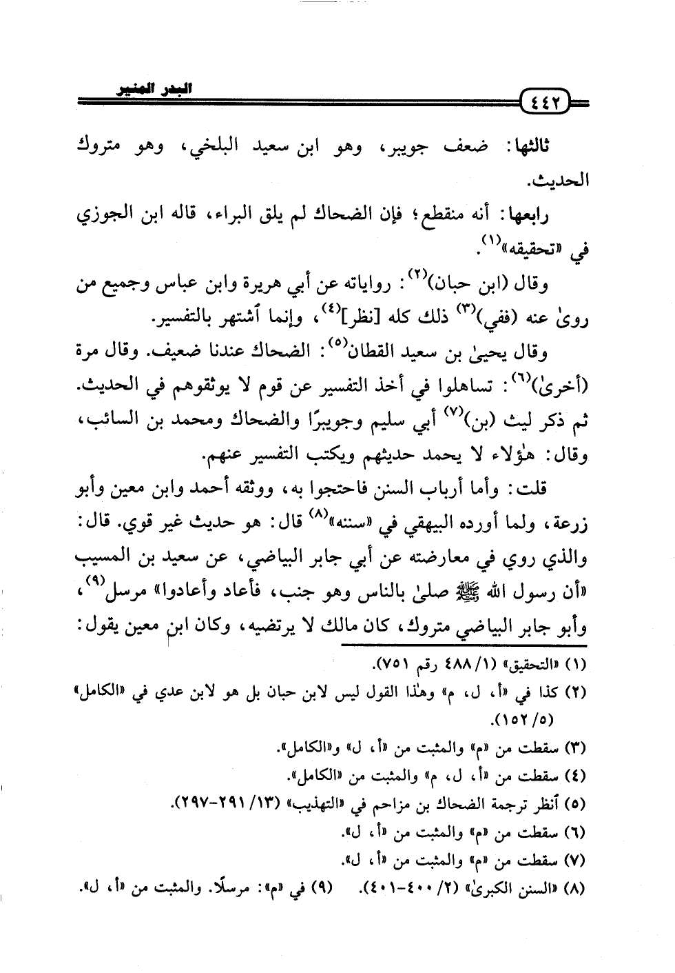 رَابِعهَا: أَنه مُنْقَطع؛ فَإِن الضَّحَّاك لم يلق الْبَراء، قَالَه ابْن الْجَوْزِيّ فِي «تَحْقِيقه» .