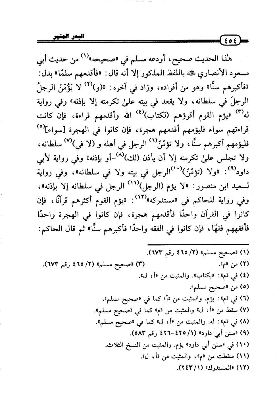 هَذَا الحَدِيث صَحِيح، أودعهُ مُسلم فِي «صَحِيحه» من حَدِيث أبي مَسْعُود الْأنْصَارِيّ رَضِيَ اللَّهُ عَنْ بِاللَّفْظِ الْمَذْكُور إِلَّا أَنه قَالَ: «فأقدمهم سلما» بدل: «فأكبرهم سنًّا» وَهُوَ من أَفْرَاده، وَزَاد فِي آخِره: « (و) لَا يَؤُمّنّ الرجلُ الرجلَ فِي سُلْطَانه، وَلَا يقْعد فِي بَيته عَلَى تكرمته إِلَّا بِإِذْنِهِ» وَفِي رِوَايَة لَهُ «يؤم الْقَوْم أقرؤهم (لكتاب) الله وأقدمهم قِرَاءَة، فَإِن كَانَت قراءتهم سَوَاء فليؤمهم أقدمهم هِجْرَة، فَإِن كَانُوا فِي الْهِجْرَة [سَوَاء] فليؤمهم أكبرهم سنًّا، وَلَا تؤمّنّ الرجل فِي أَهله و (لَا فِي) سُلْطَانه، وَلَا تجْلِس عَلَى تكرمته إِلَّا أَن يَأْذَن (لَك) - أَو بِإِذْنِهِ» وَفِي رِوَايَة لأبي دَاوُد: «وَلَا (تؤمّنّ) الرجل فِي بَيته وَلَا فِي سُلْطَانه» ، وَفِي رِوَايَة لسَعِيد ابْن مَنْصُور: «لَا يؤم (الرجل) الرجل فِي سُلْطَانه إِلَّا بِإِذْنِهِ» ، وَفِي رِوَايَة للْحَاكِم فِي «مُسْتَدْركه» : «يؤم الْقَوْم أَكْثَرهم قُرْآنًا، فَإِن كَانُوا فِي الْقُرْآن وَاحِدًا فأقدمهم هِجْرَة، فَإِن كَانُوا فِي الْهِجْرَة وَاحِدًا فأفقههم فقهًا، فَإِن كَانُوا فِي الْفِقْه وَاحِدًا فأكبرهم سنًّا» ثمَّ قَالَ الْحَاكِم: