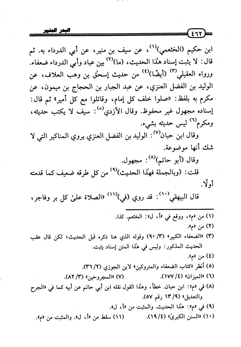 بن حَكِيم (الْخَثْعَمِي) ، عَن سيف بن مُنِير، عَن أبي الدَّرْدَاء بِهِ. ثمَّ قَالَ: لَا يثبت إِسْنَاد هَذَا الحَدِيث، (مَا) بَين عباد وَأبي الدَّرْدَاء ضعفاء. وَرَوَاهُ الْعقيلِيّ (أَيْضا) من حَدِيث إِسْحَاق بن وهب العلاف، عَن الْوَلِيد بن الْفضل الْعَنزي، عَن عبد الْجَبَّار بن الْحجَّاج بن مَيْمُون، عَن مكرم بِهِ بِلَفْظ: «صلوا خلف كل إِمَام، وقاتلوا مَعَ كل أَمِير» ثمَّ قَالَ: إِسْنَاده مَجْهُول غير مَحْفُوظ. وَقَالَ الْأَزْدِيّ: سيف لَا يكْتب حَدِيثه، ومكرم لَيْسَ حَدِيثه بِشَيْء.