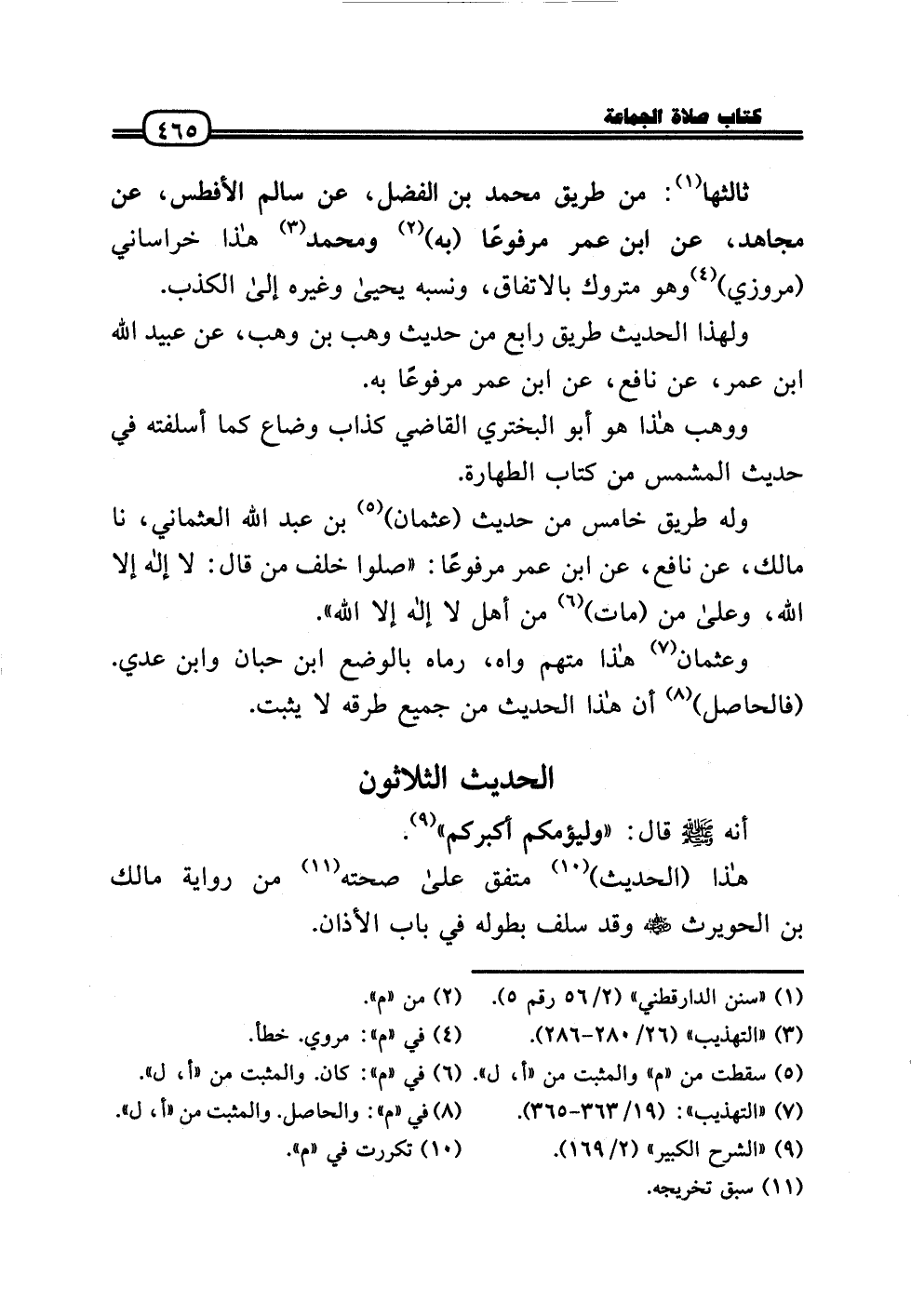 ثَالِثهَا: من طَرِيق مُحَمَّد بن الْفضل، عَن سَالم الْأَفْطَس، عَن مُجَاهِد، عَن ابْن عمر مَرْفُوعا (بِهِ) وَمُحَمّد هَذَا خراساني (مروزي) وَهُوَ مَتْرُوك بالِاتِّفَاقِ، وَنسبه يَحْيَى وَغَيره إِلَى الْكَذِب.
